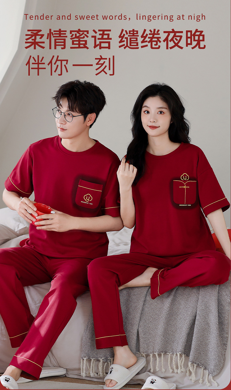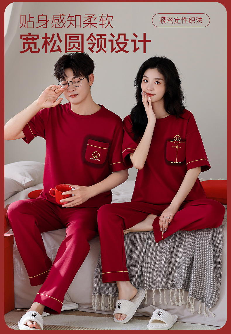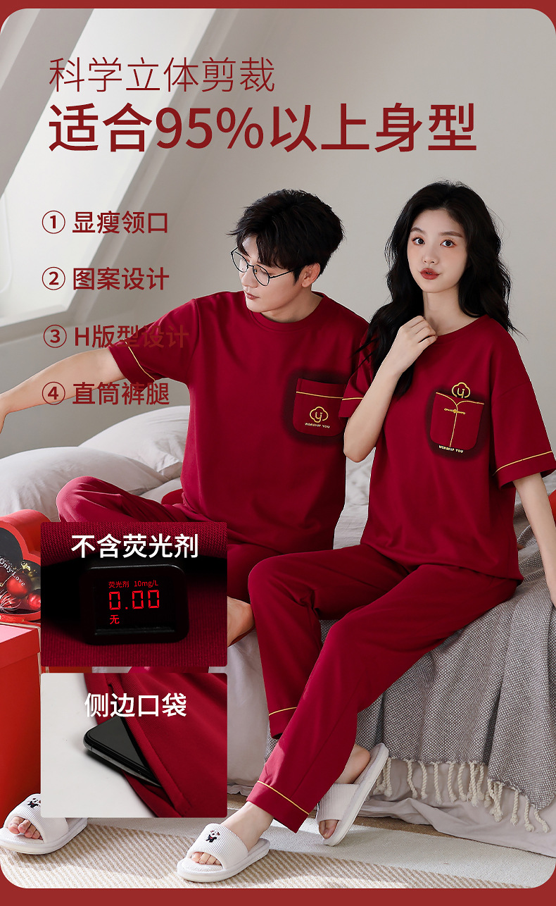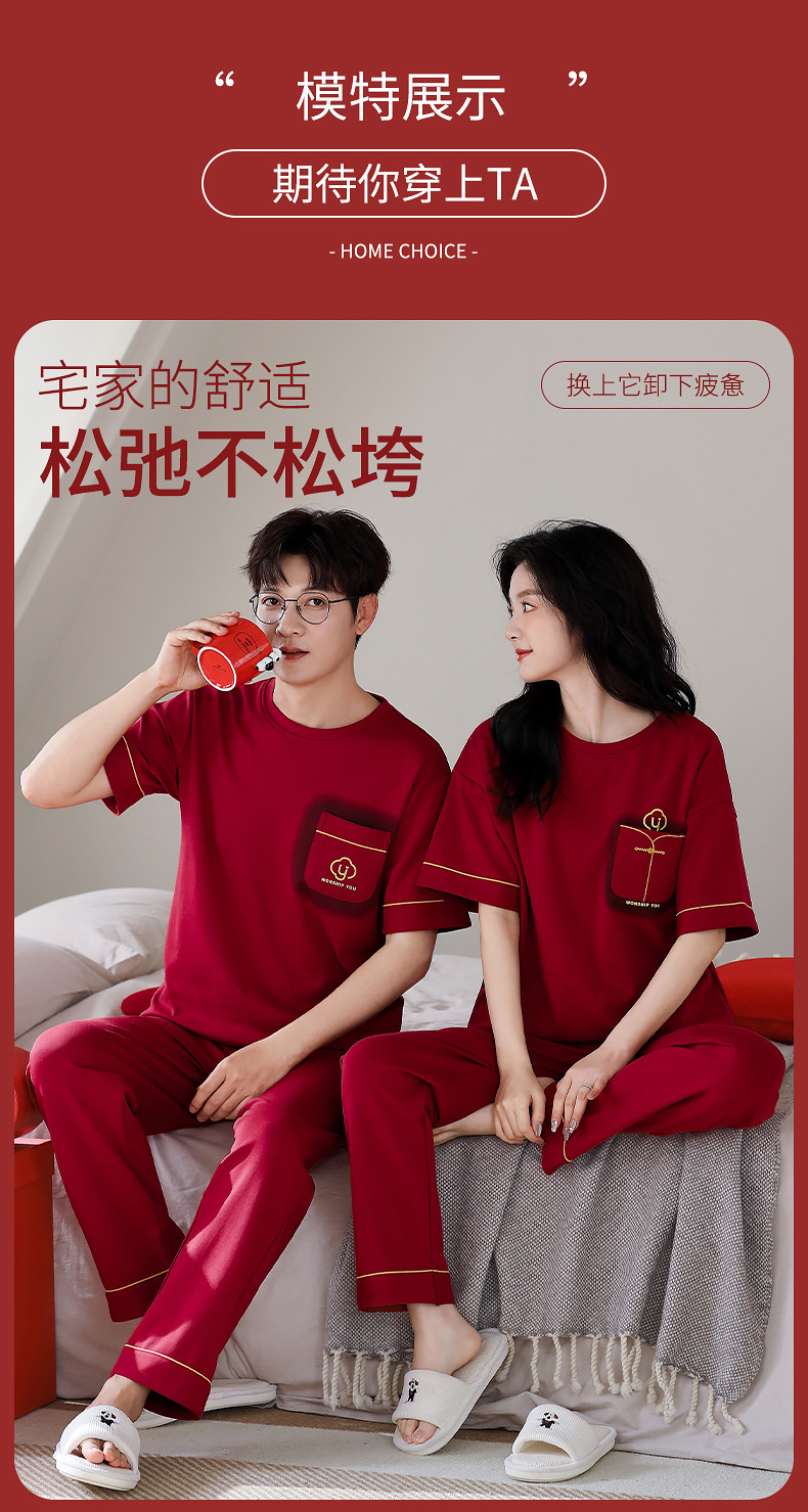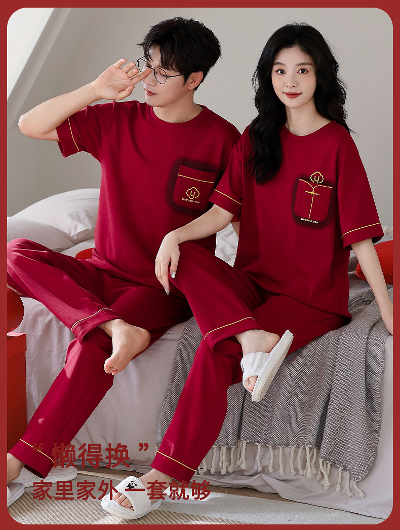 春夏結婚カップルパジャマ新婚夏純綿半袖長ズボン赤おめでたい本命年ホームウェアセット