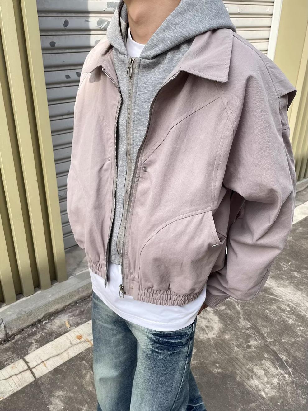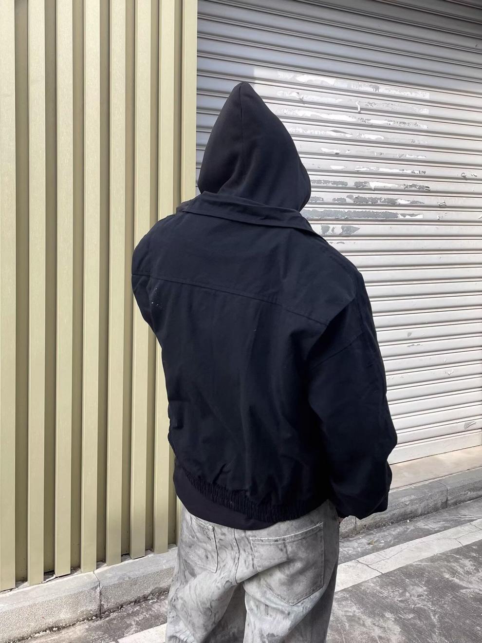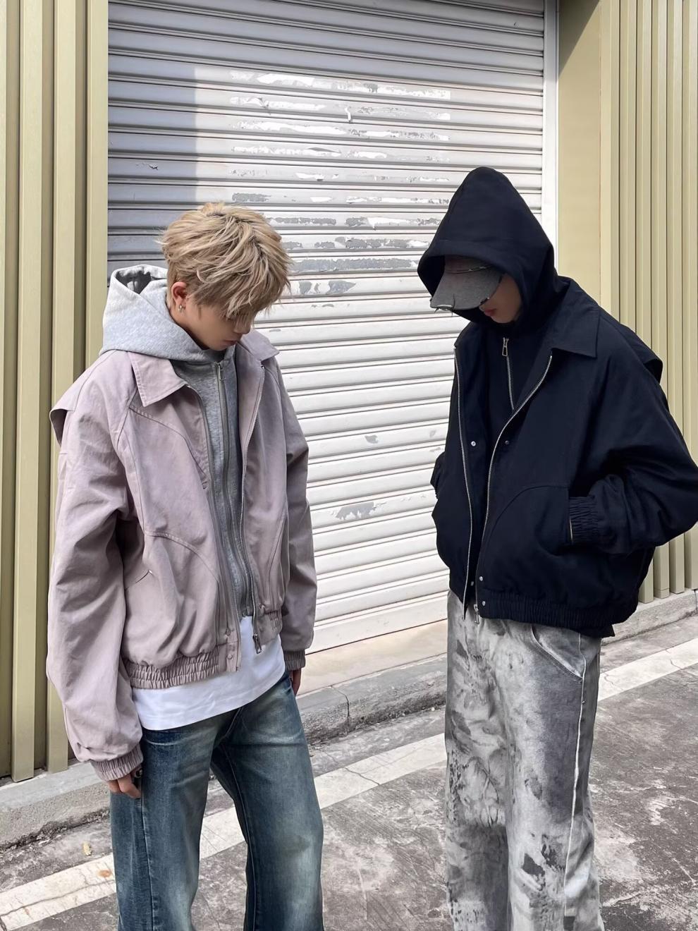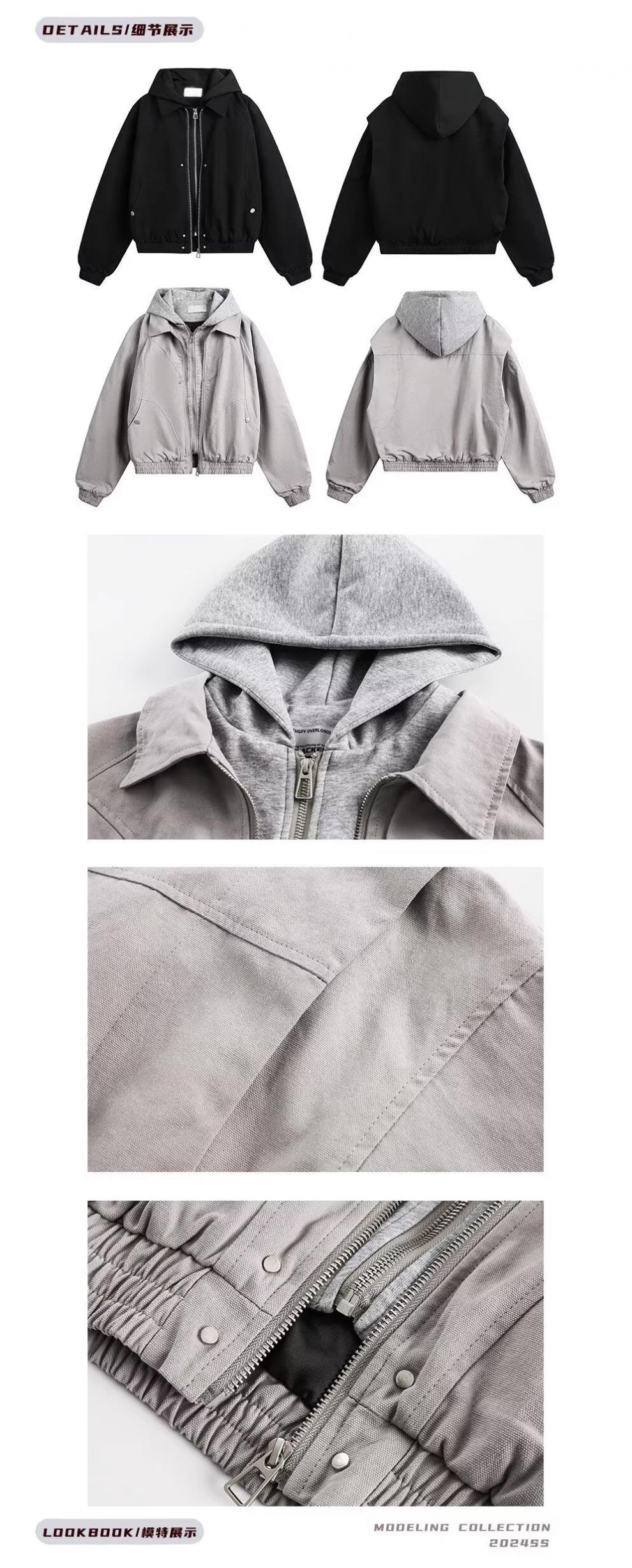 春秋のアメリカのレトロな青少年の郭の形のジャケットの男女のごろつきのかっこいい偽の2つのデザイン感は帽子のコートの潮に関連します。