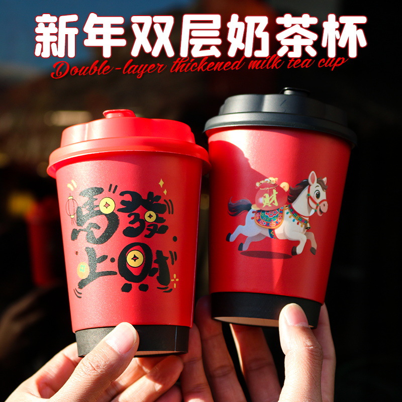 马上发财双层纸杯红色咖啡杯一次性带盖热饮耐高温高档精致奶茶杯