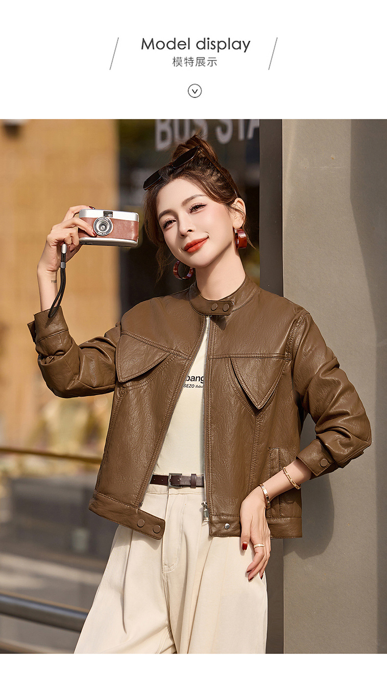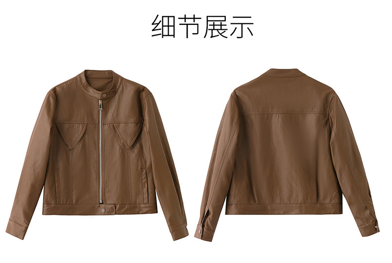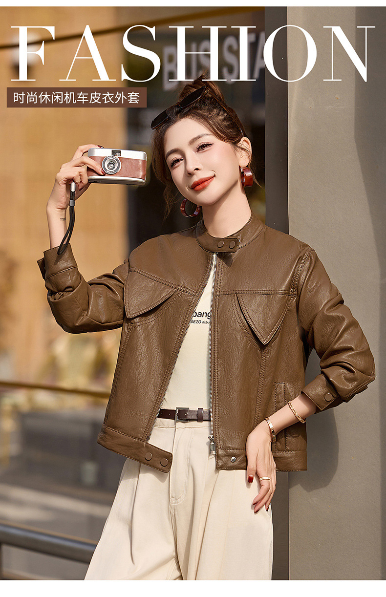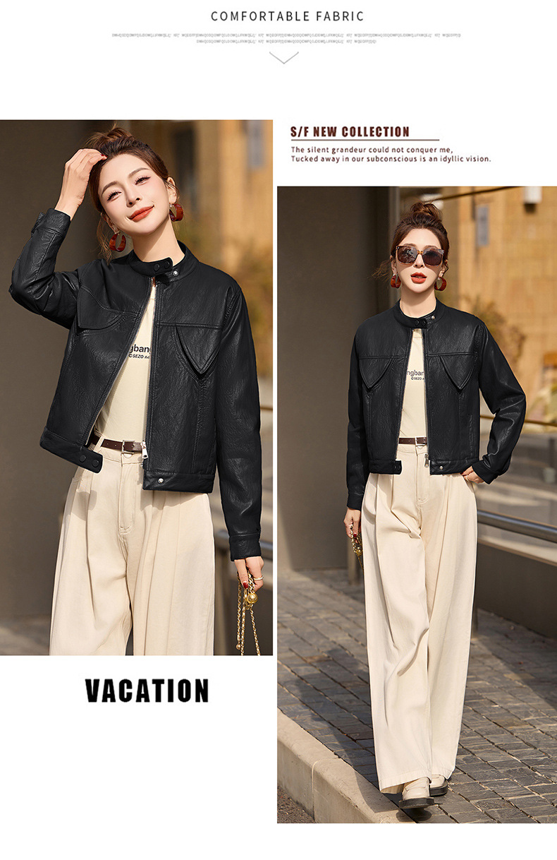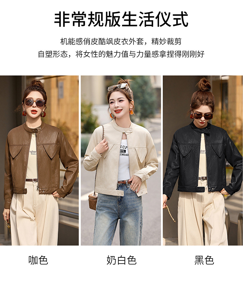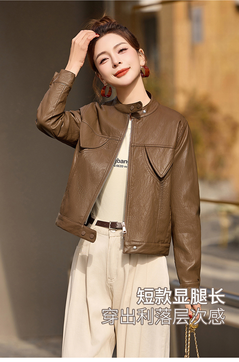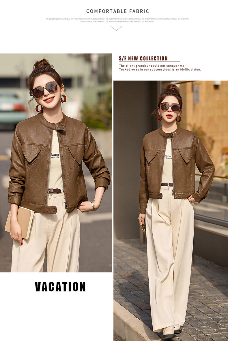女性の皮の服の2025春の新型の婦人服の立襟のファッション的な洋風pu皮のジャケットのショートコートXG9965