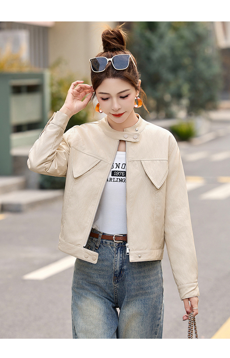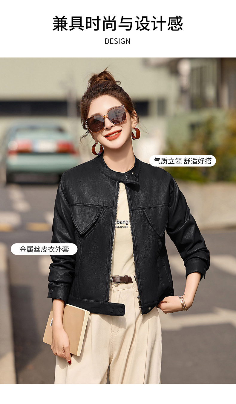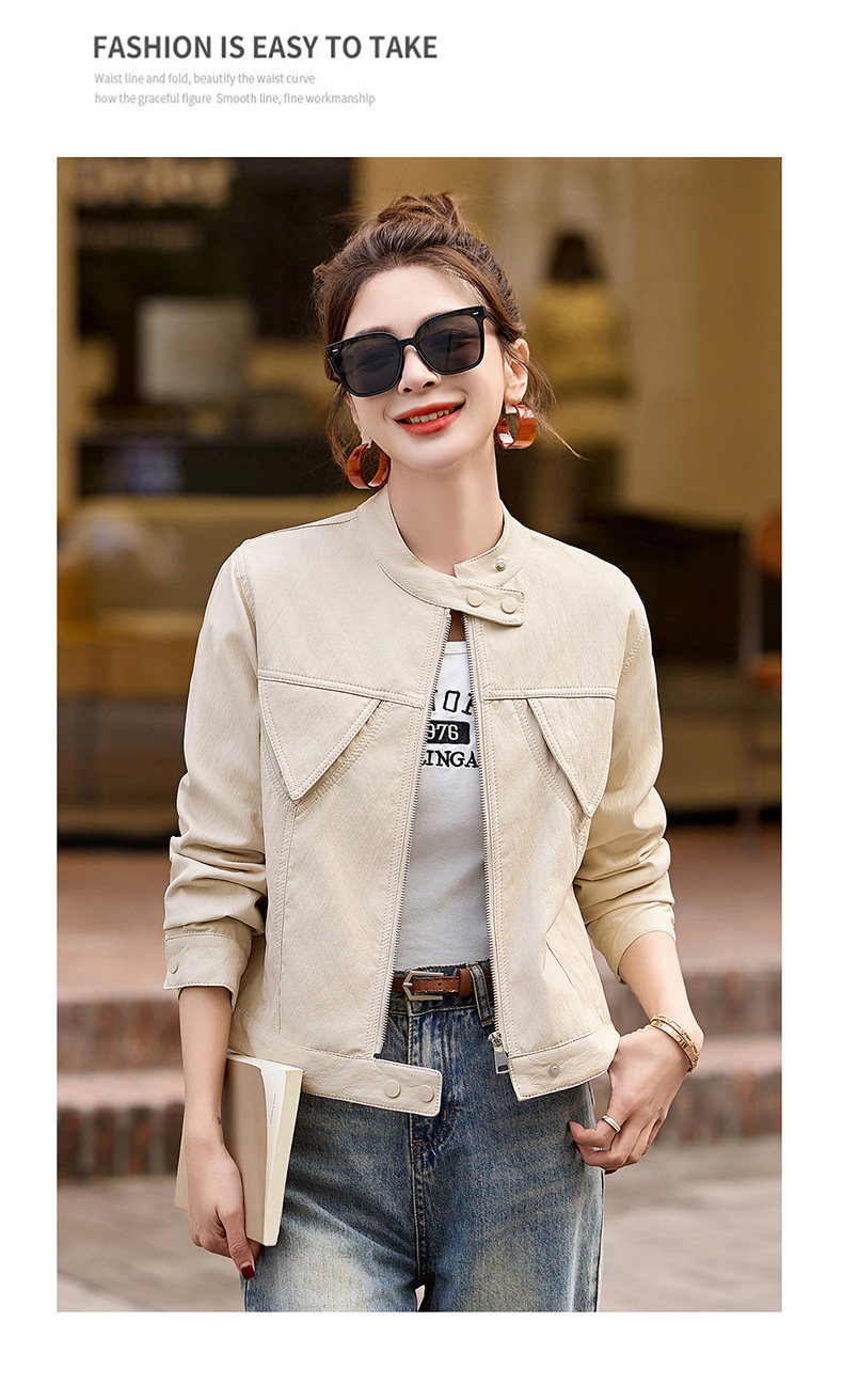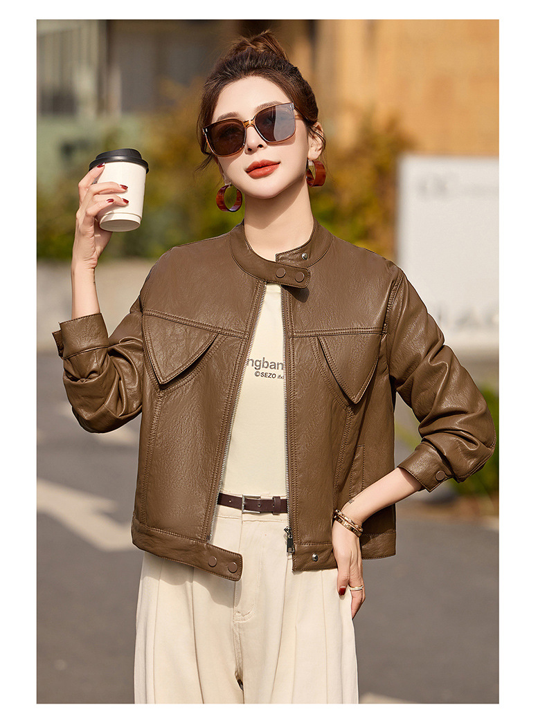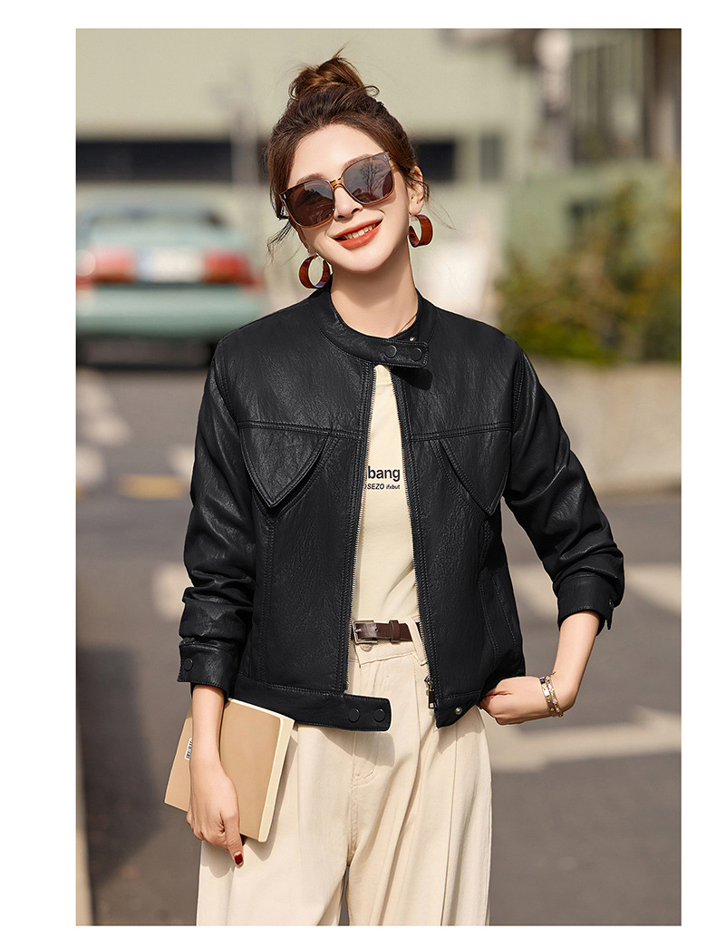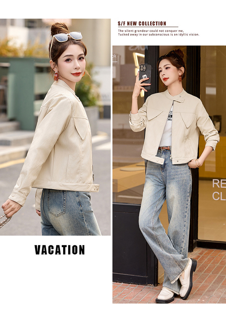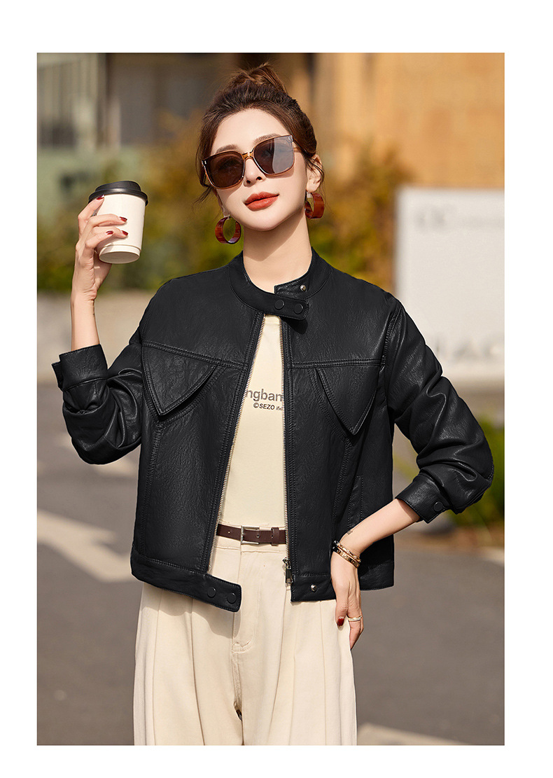 女性の皮の服の2025春の新型の婦人服の立襟のファッション的な洋風pu皮のジャケットのショートコートXG9965