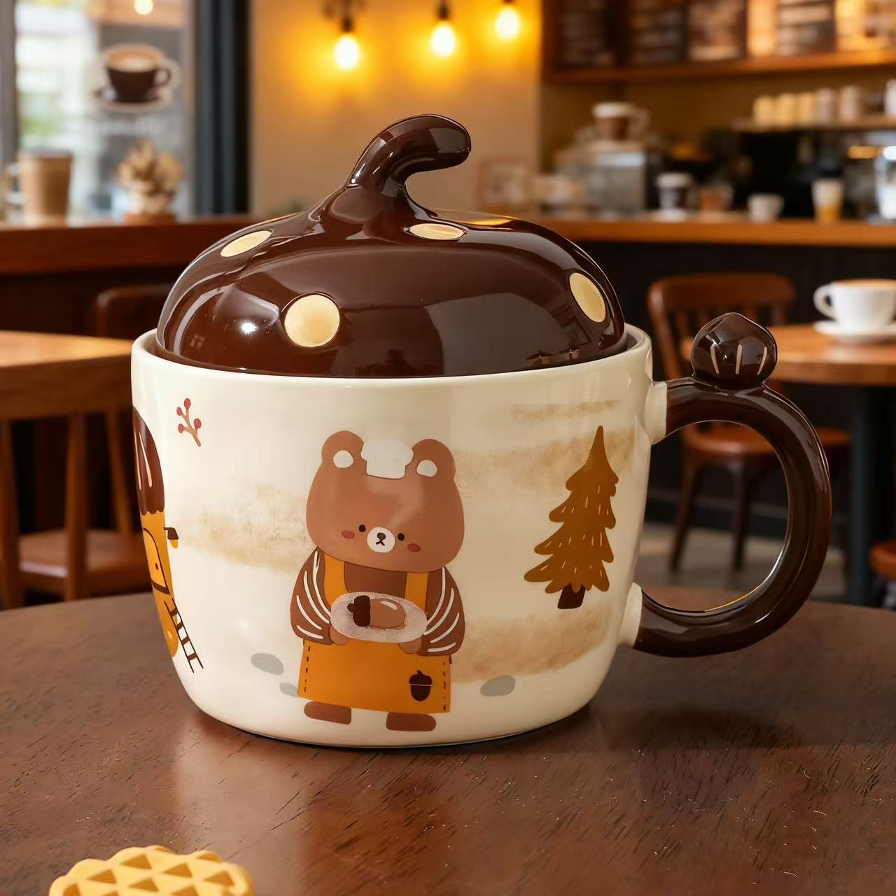 萌趣小熊马克杯可爱造型坚果陶瓷盖杯子高颜值大容量卡通水杯套装