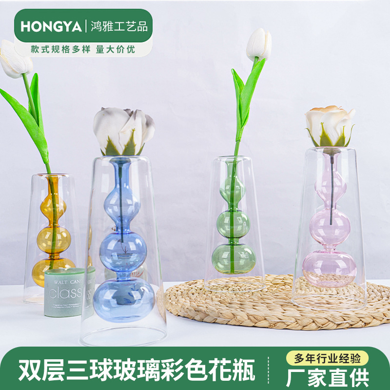 二重二球ガラスカラー花瓶高ホウ素シリコン透明ガラス置物客間生け花水培