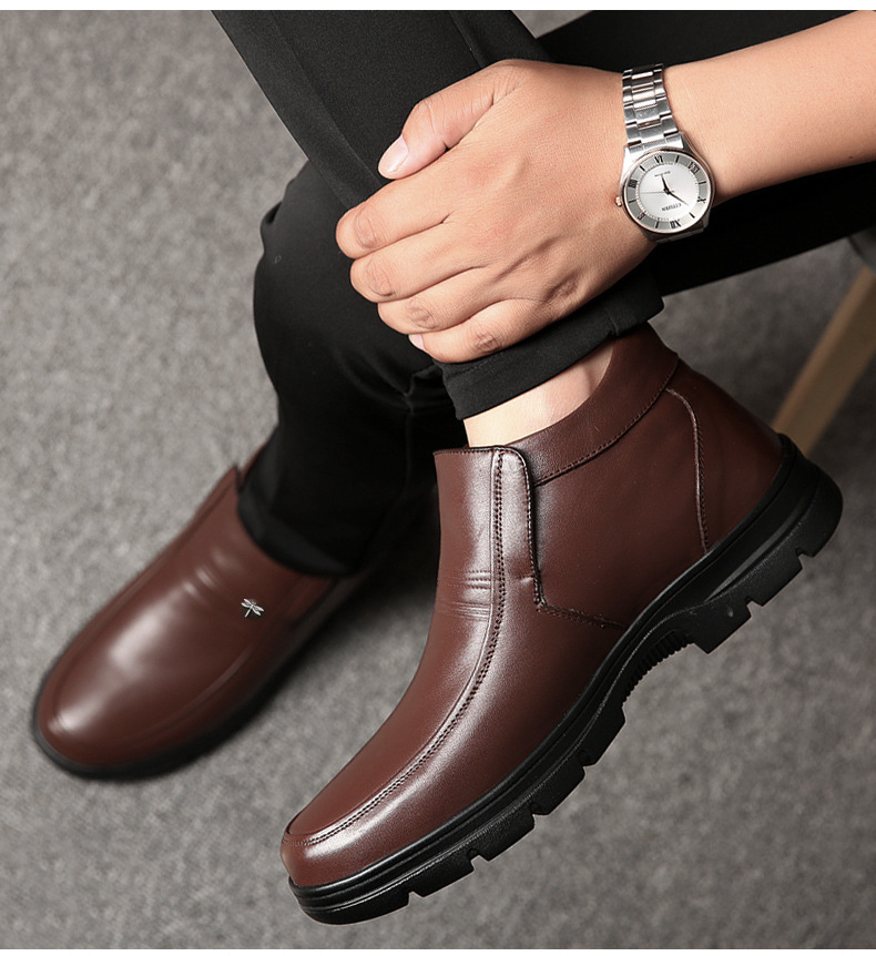 【トップ牛革】秋冬男性本革カジュアルシューズビジネスベルベット保温綿革靴男性綿靴お父さん靴