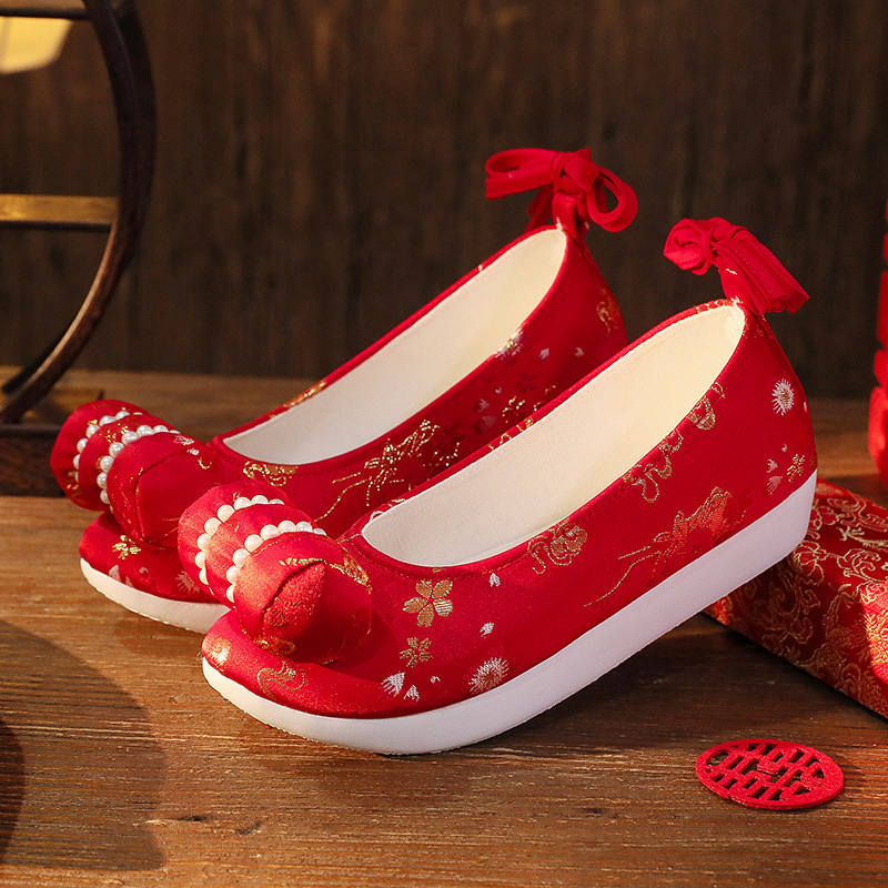 花嫁の靴の漢服の靴の丸い頭の赤い底の金糸の刺繍の秀禾の結婚服の靴の靴の靴の刺繍の布の靴の女性の靴