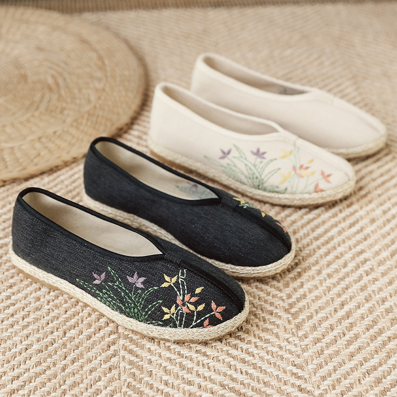 民族風の国風のキャンバスの刺繍の布の靴の女性の靴のシングル靴の1字は低いです。