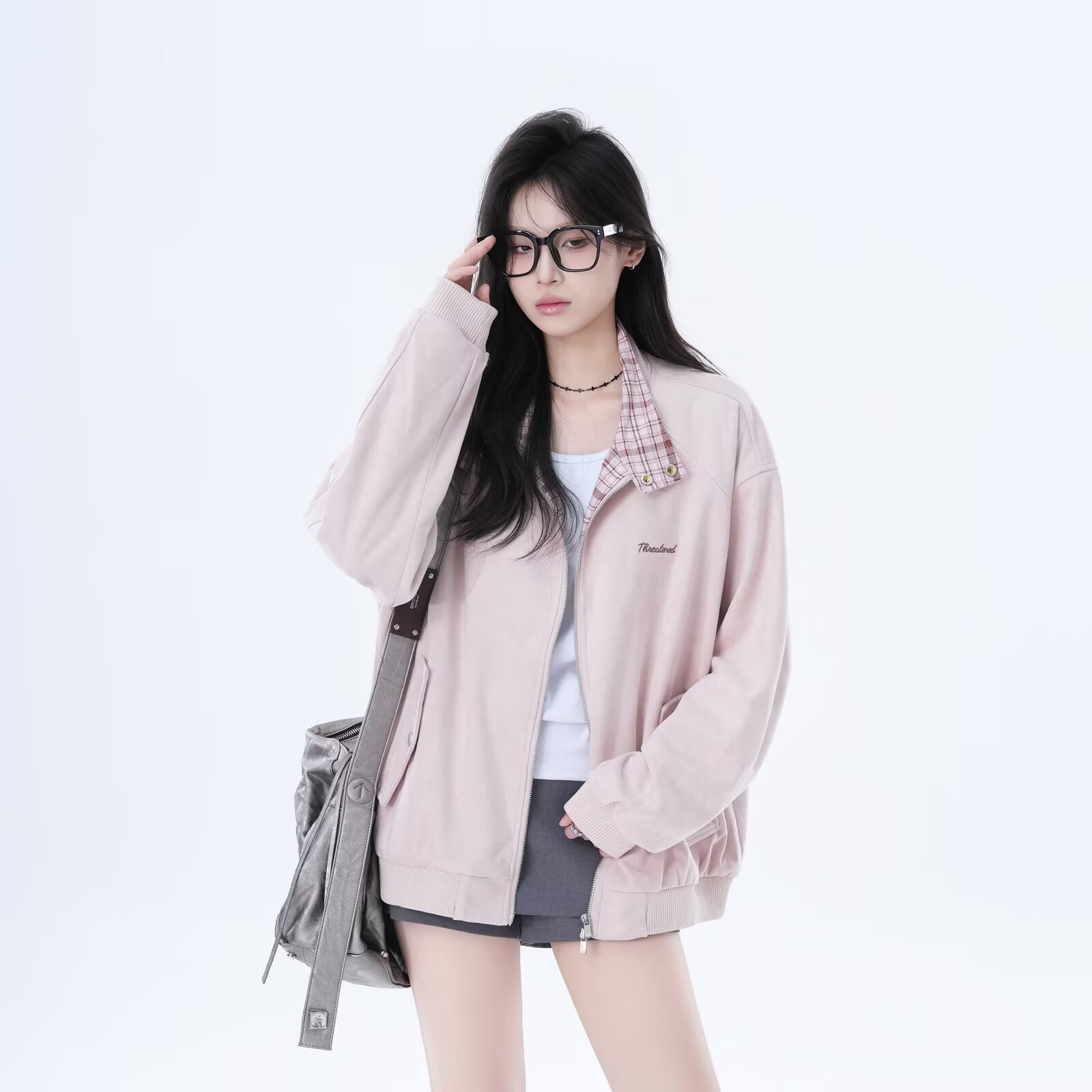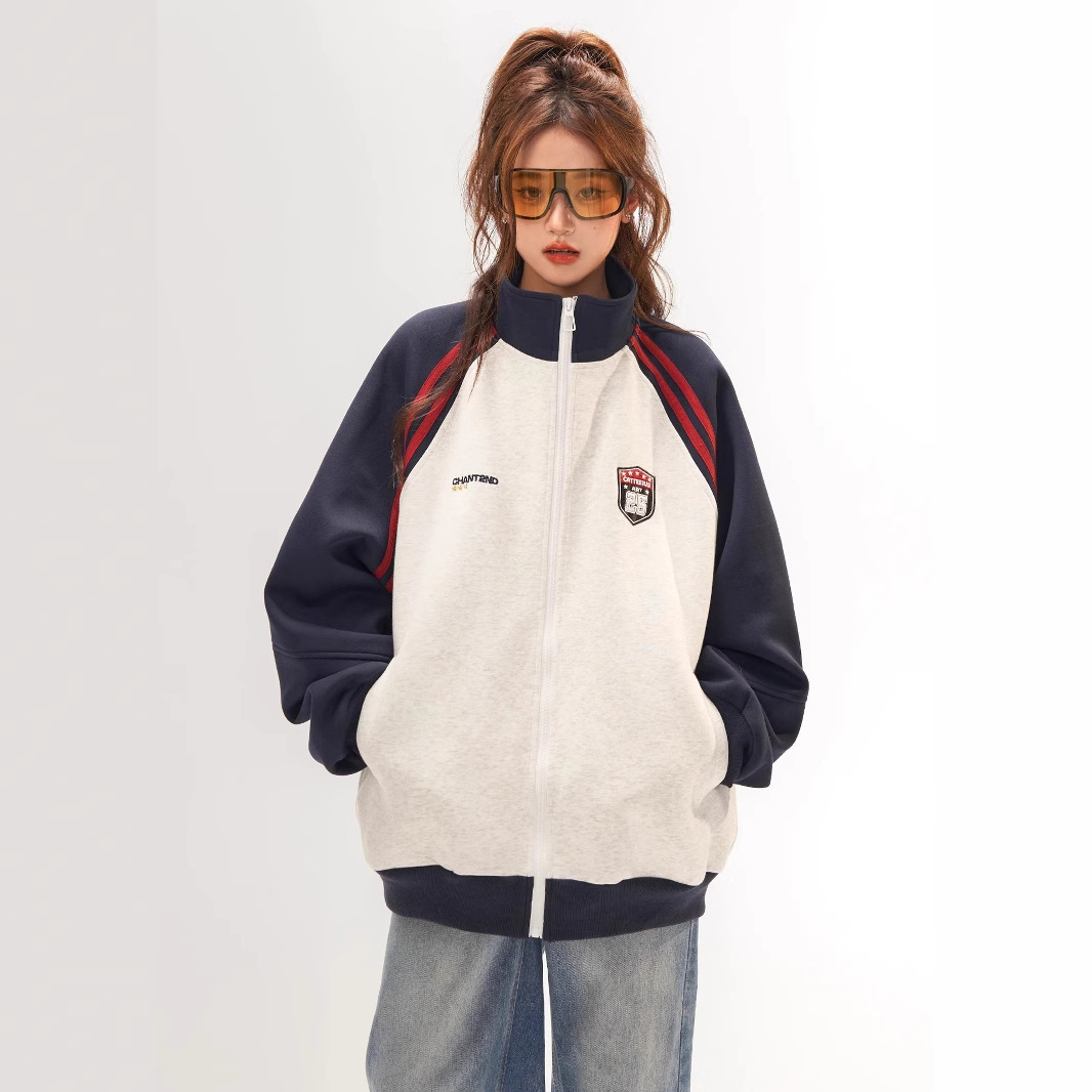 美式复古拼色翻领外套女秋季2025新款休闲宽松男女棒球服夹克上衣