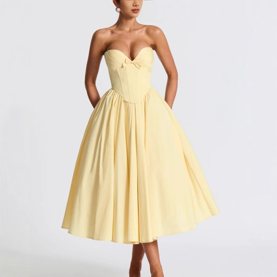 法式甜美氛围感蝴蝶结饰抹胸鱼骨钢托收腰吊带连衣裙纯色欧美长裙