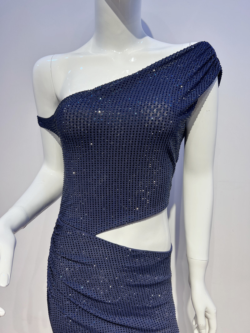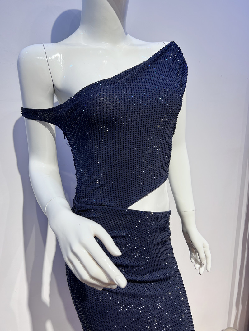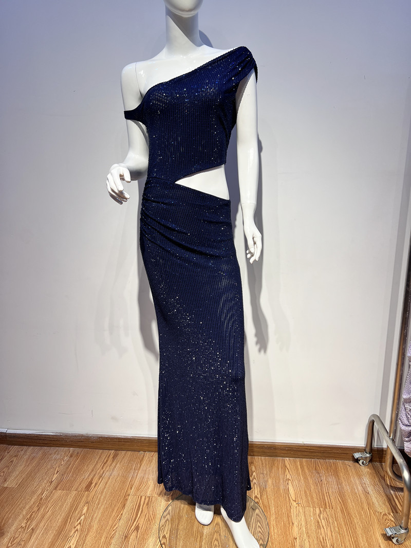 人気海外婦人服卸売、ファッショナブルなラインストーン付きワンピース、長袖、透かし彫り、ウエストシェイプ、フィッシュテールドレス