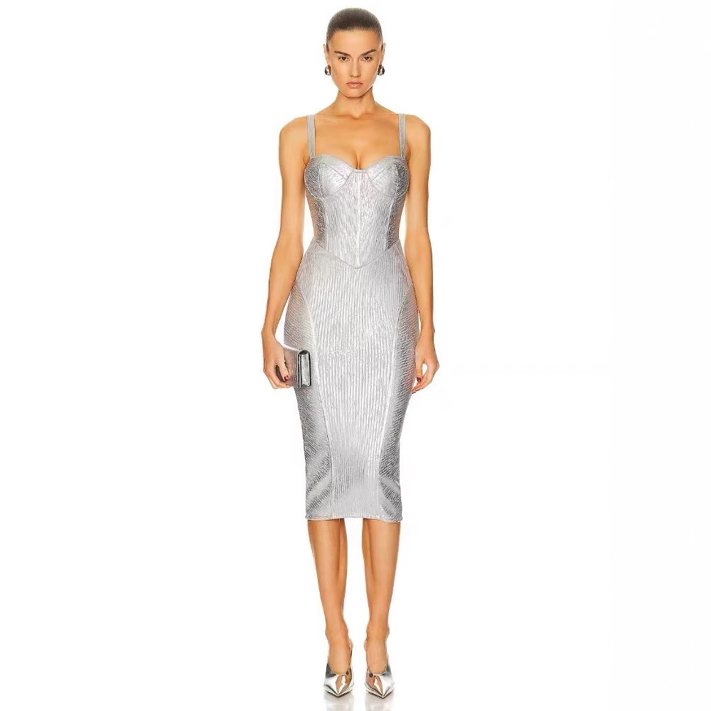 現物の対外貿易の輸出の重工の銀のストラップのvネックのワンピースの軽い豪華なパーティーの宴会はやせている包帯のイブニング・ドレスを現します。