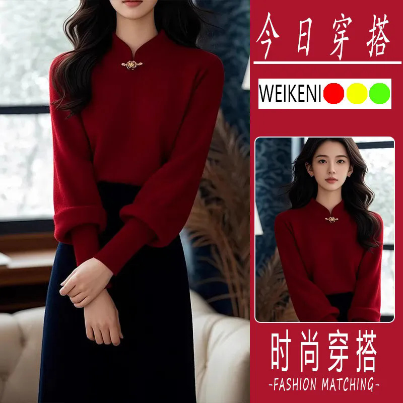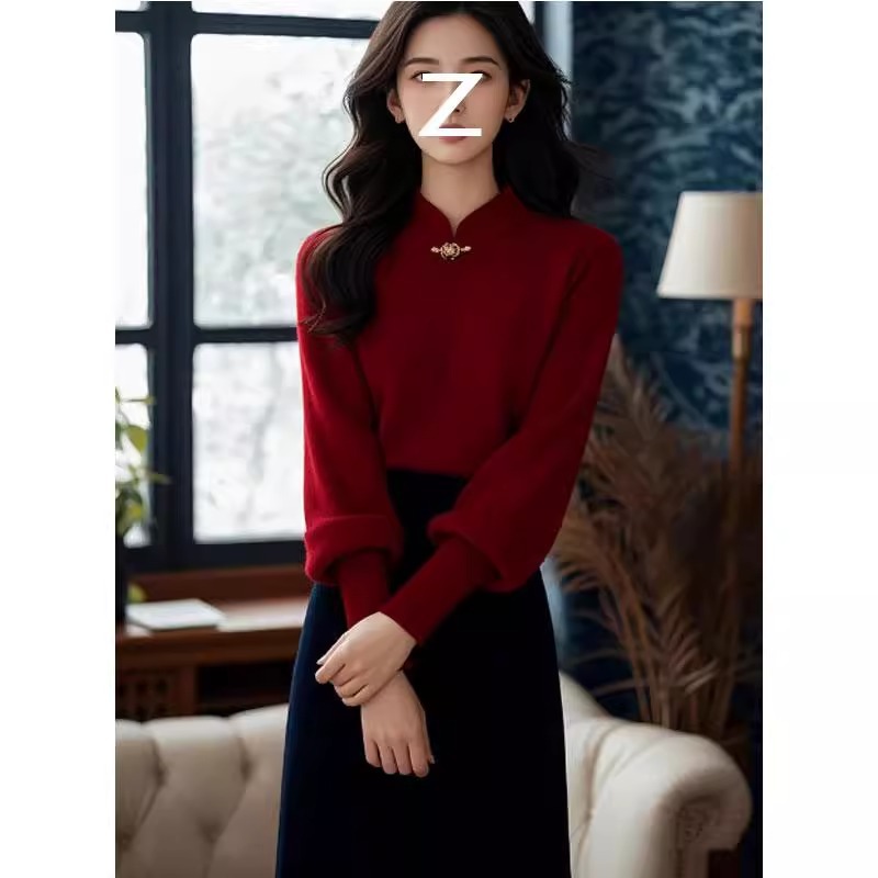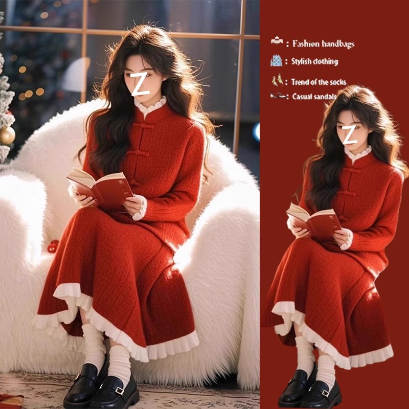 2025セットの女性の春の新型の正月の雰囲気は赤いニットを着ています。