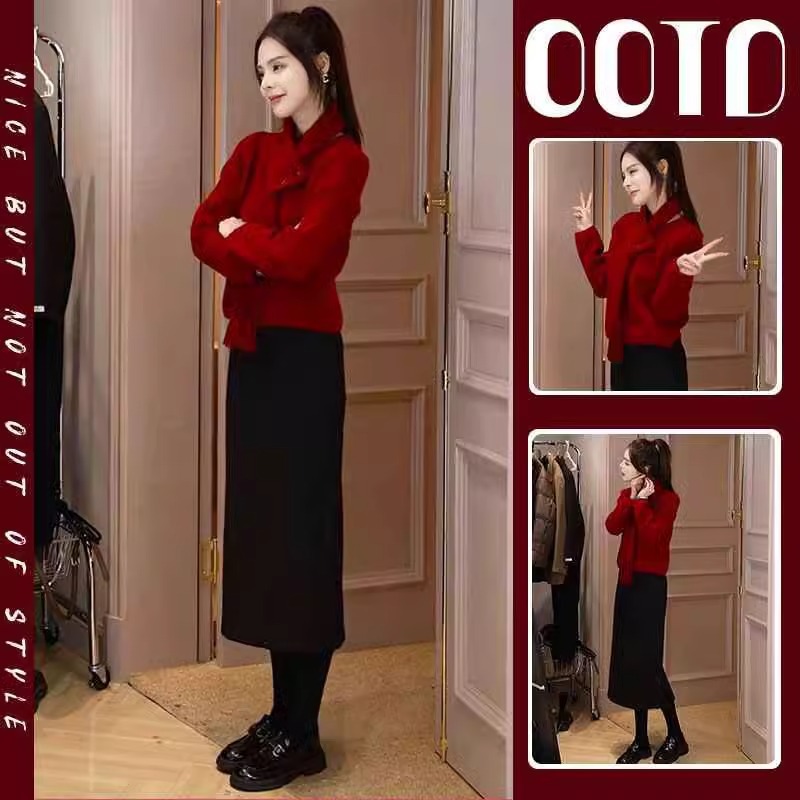 2025超火秋冬女装赤い新年服軍服高級感着半身スカート2点セット