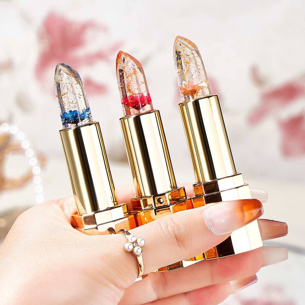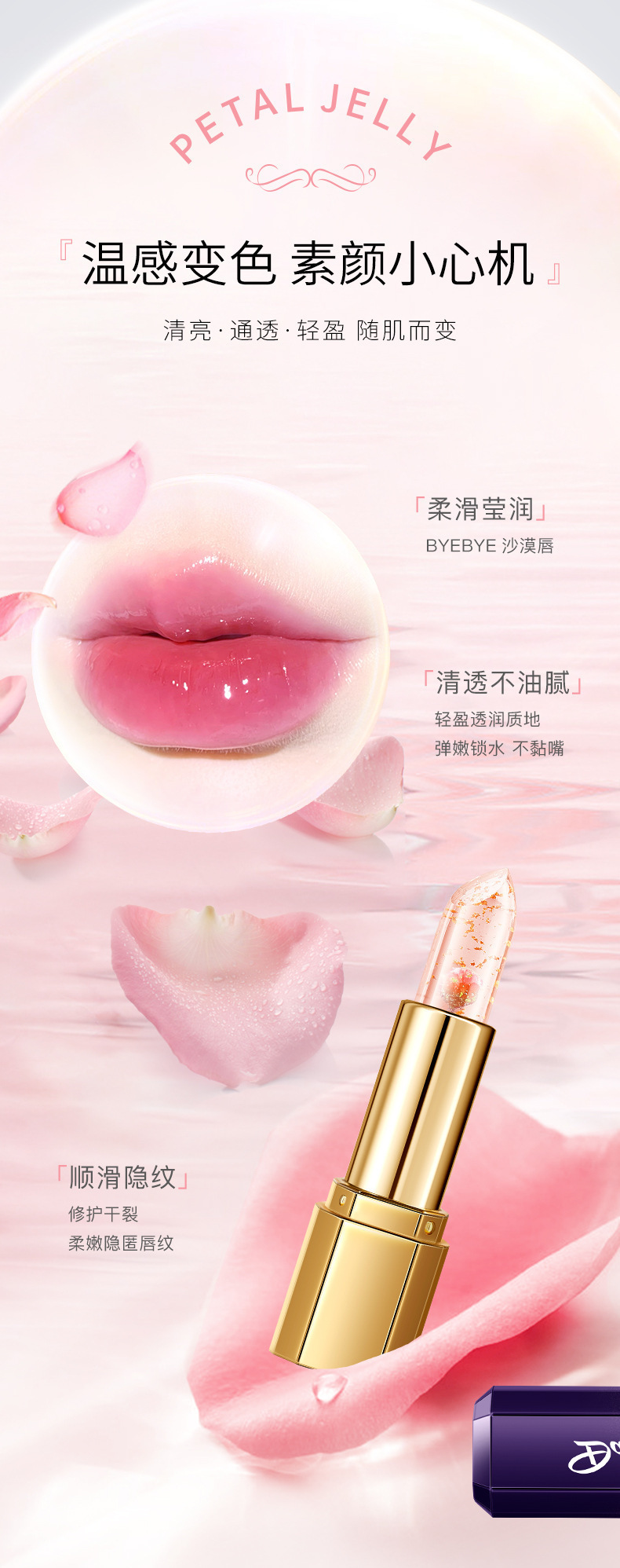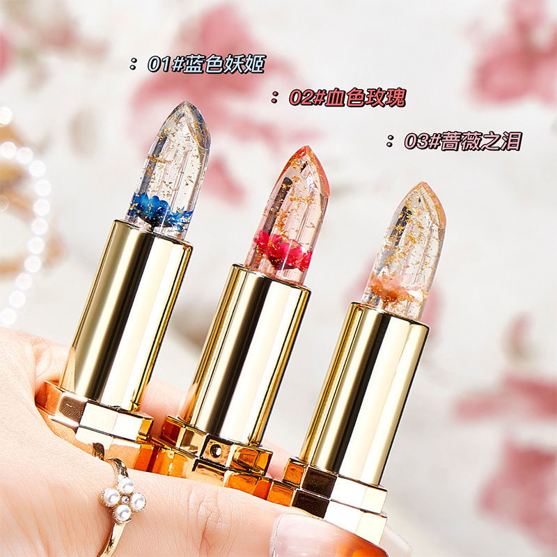 花瓣鲜花口红透明果冻变色唇膏金箔温变不沾杯不掉色滋润保湿批发