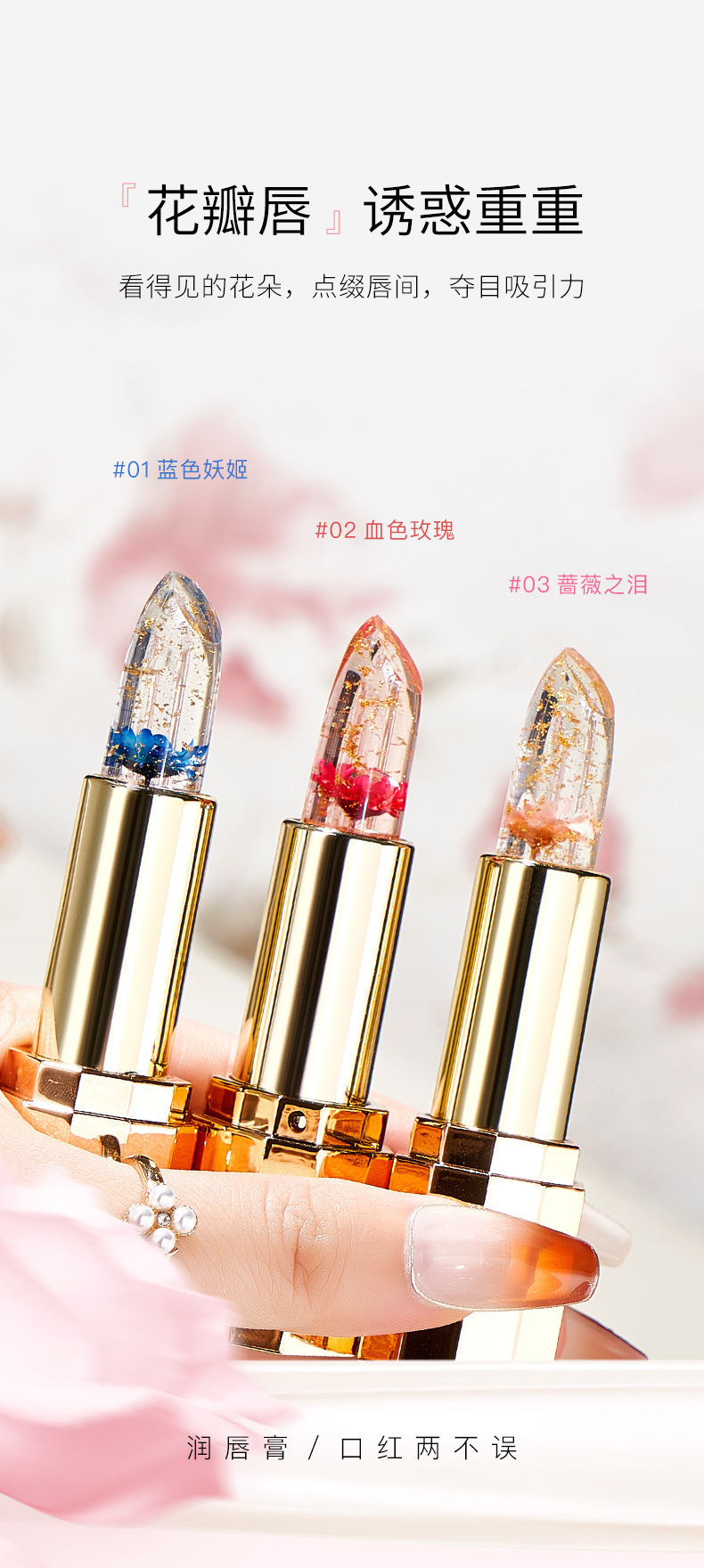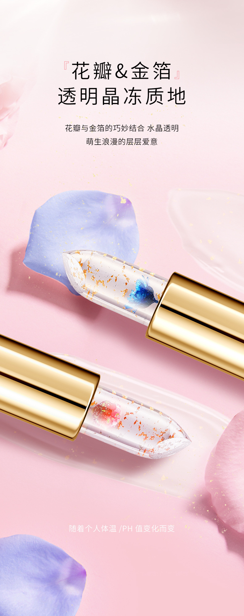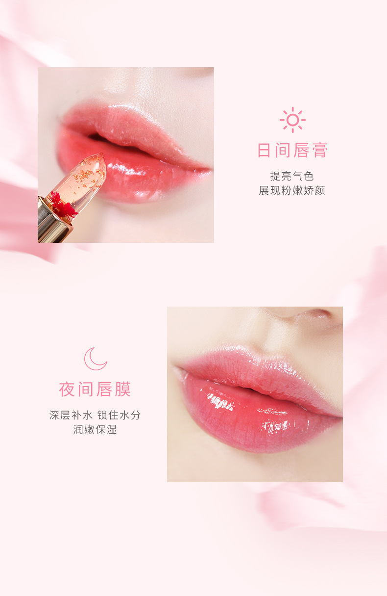 花瓣鲜花口红透明果冻变色金箔温变唇膏不沾杯不掉色滋润保湿批发