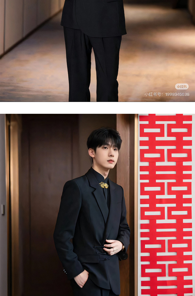 新中式男西装小众新郎潮套装高级感黑色圆领宽松垫肩西服外套