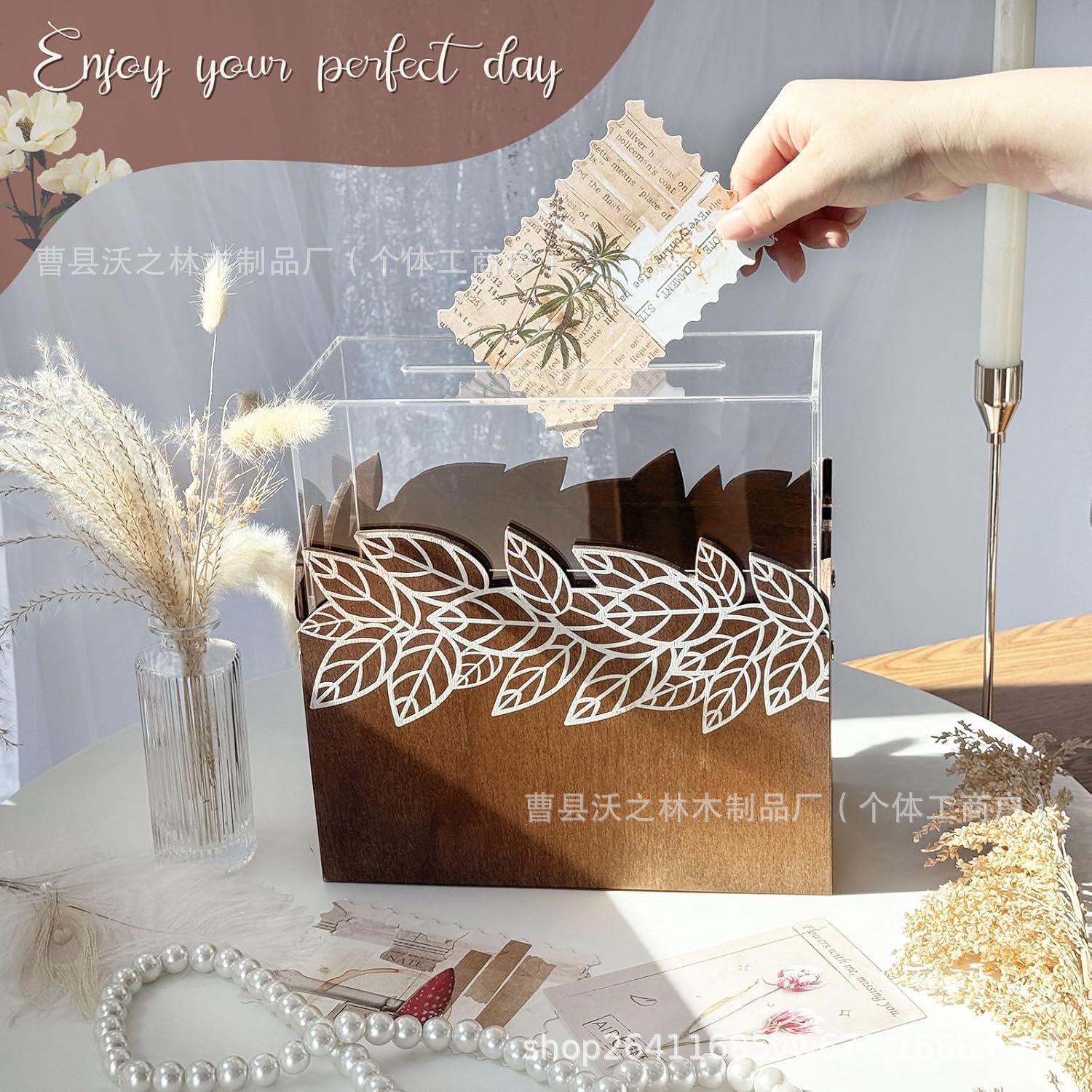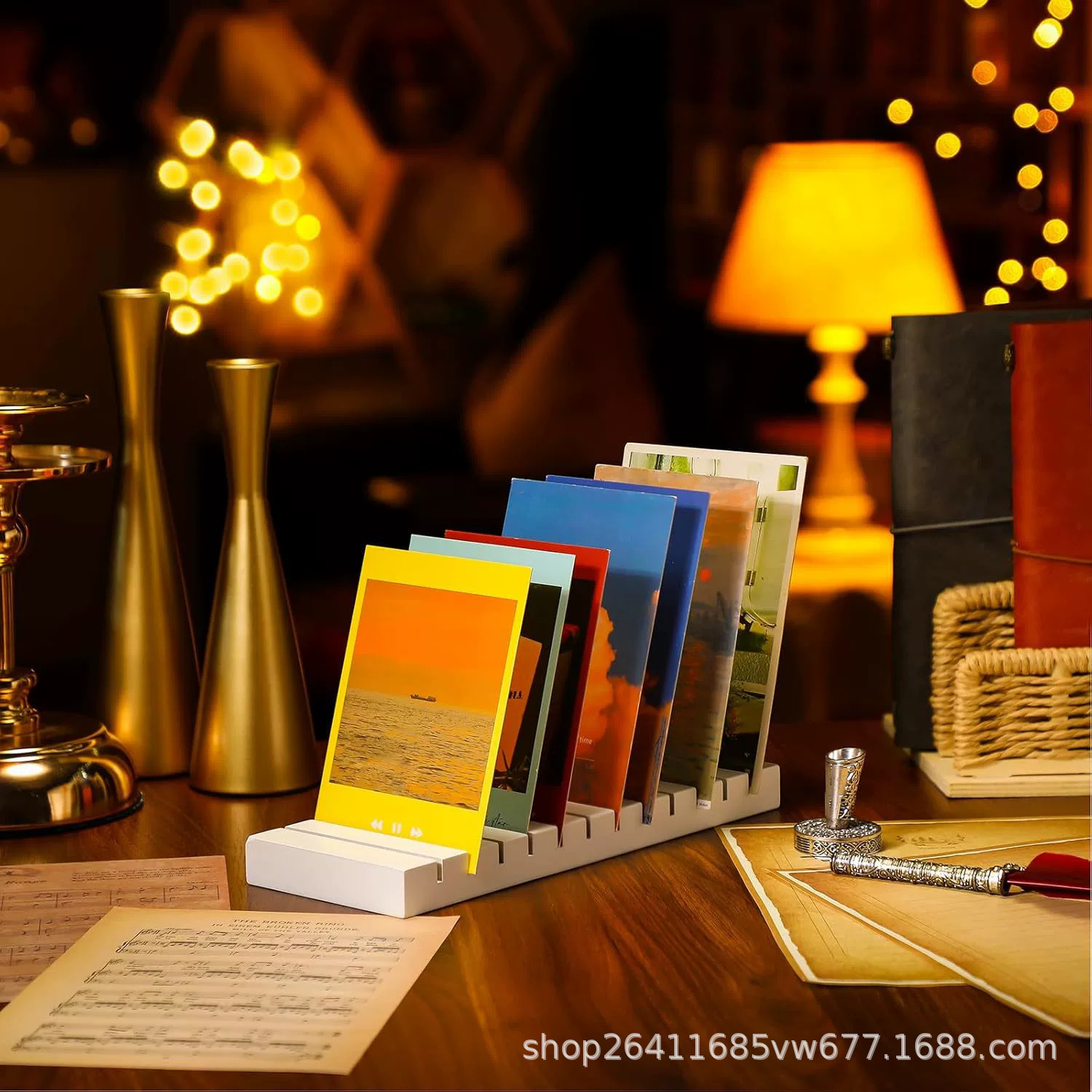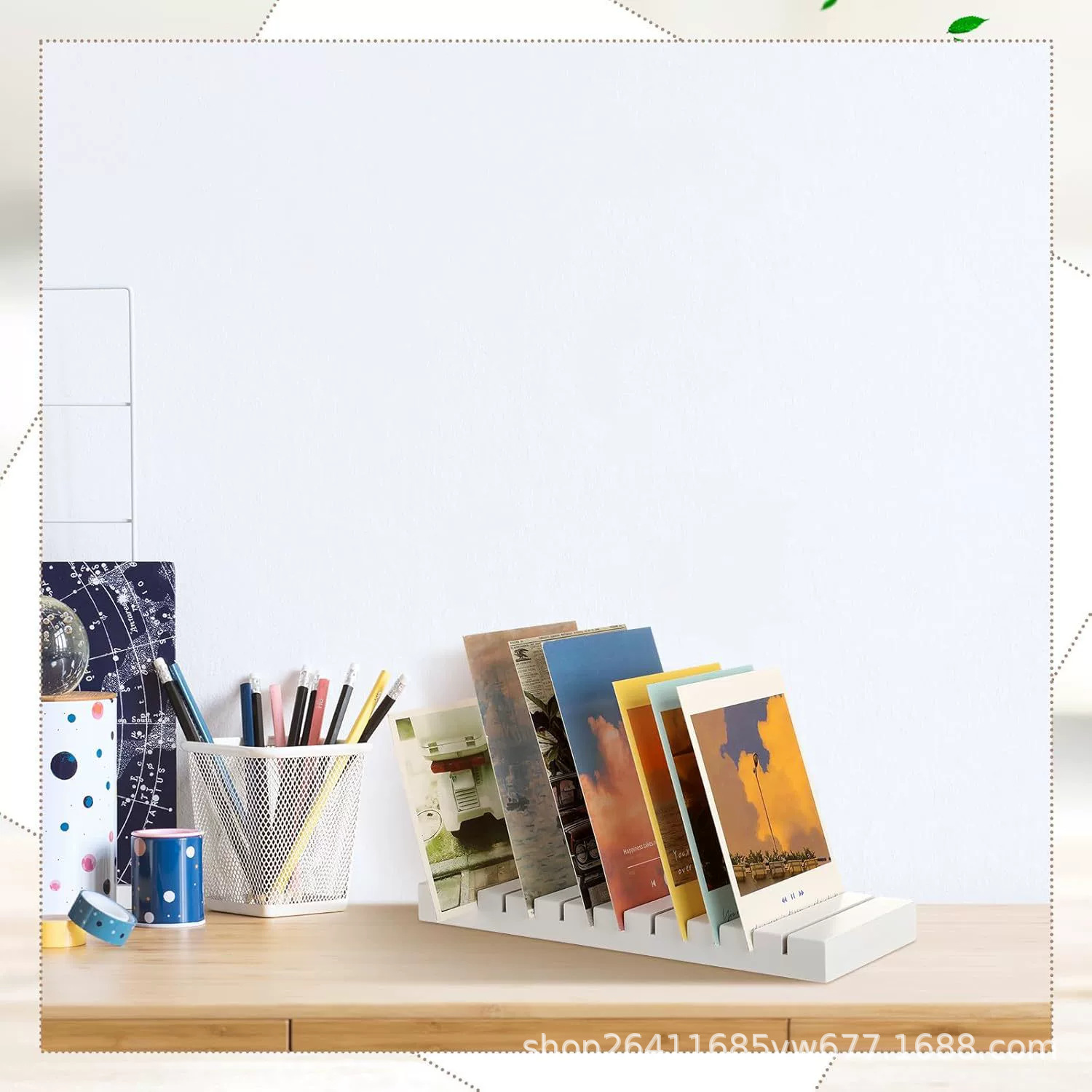 木製の長方形の付箋のカードの台座の事務室のデスクトップの封筒のメールの支柱の広告の単一の物置棚