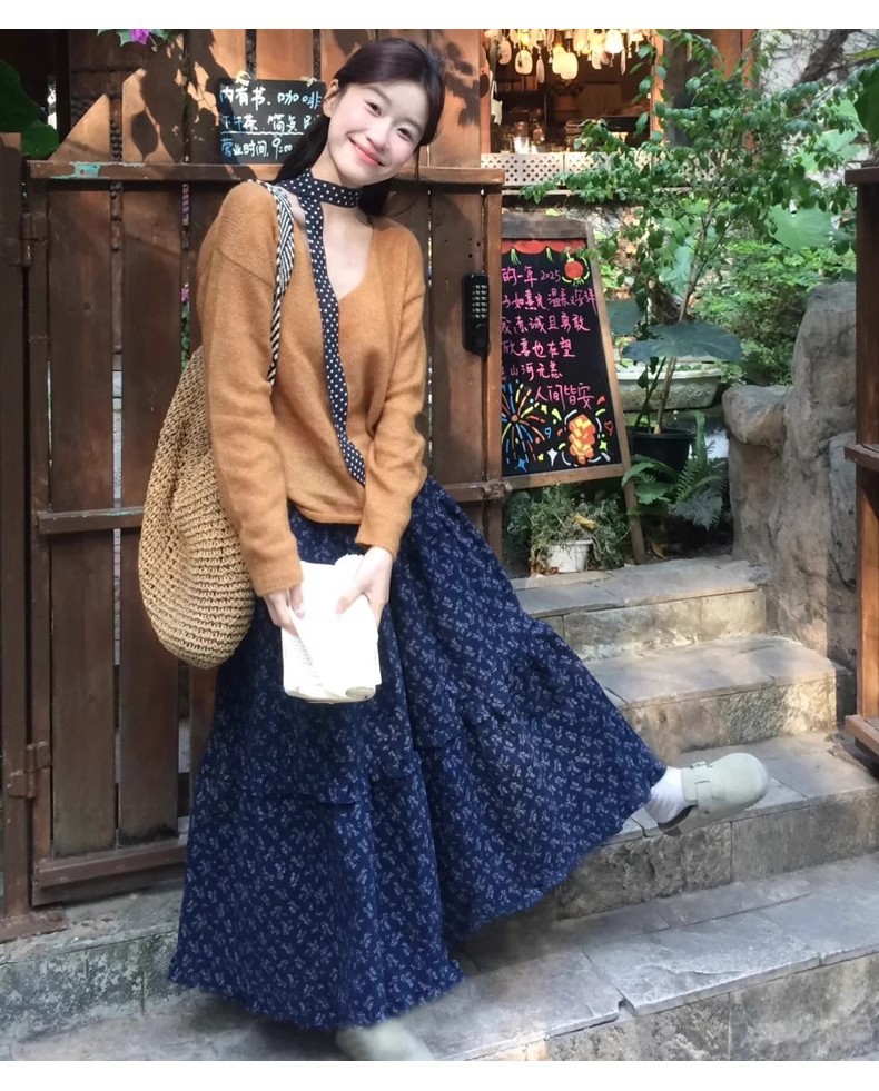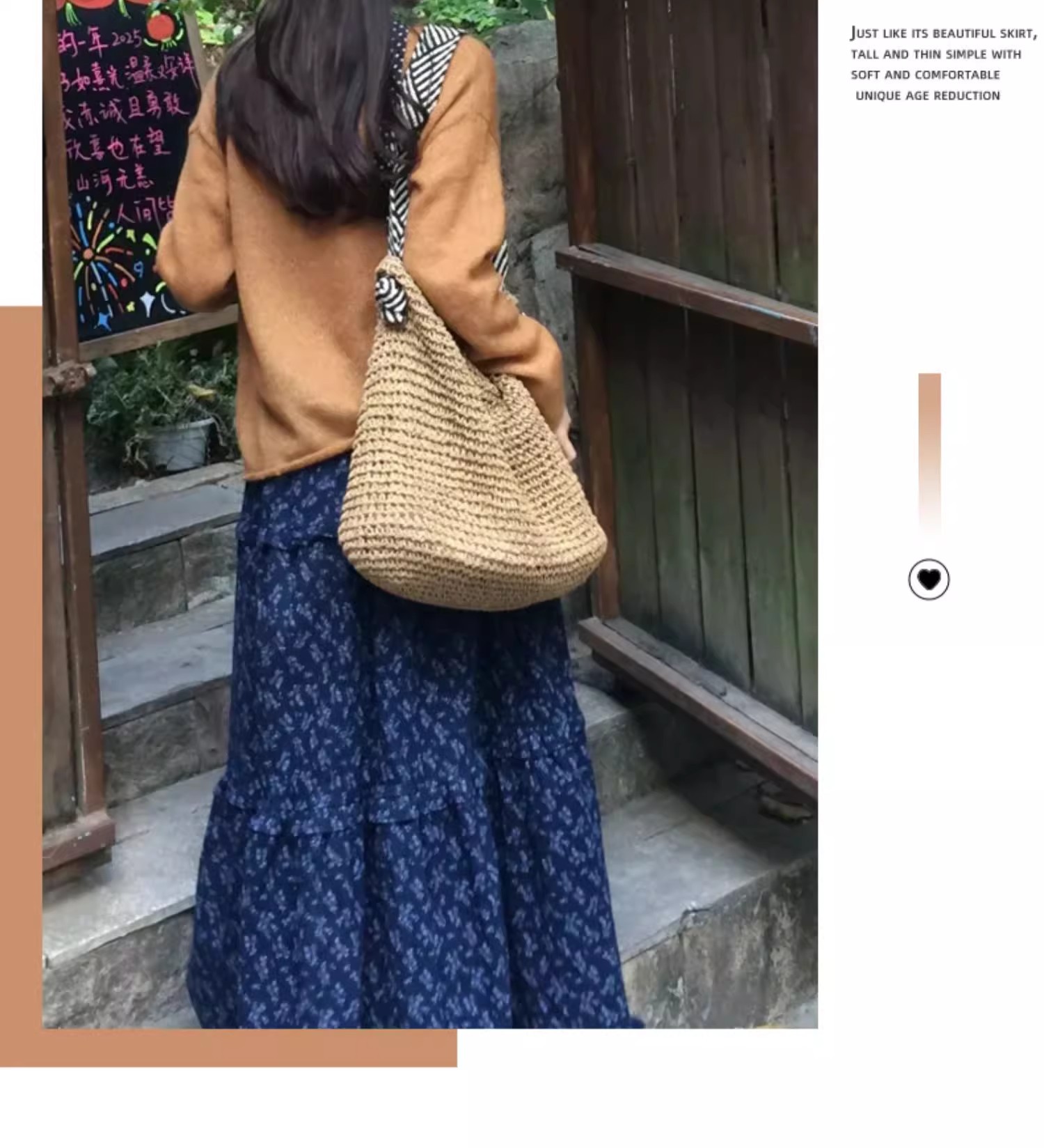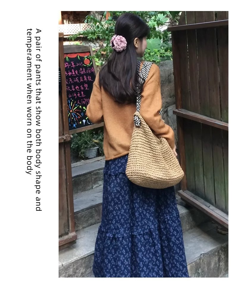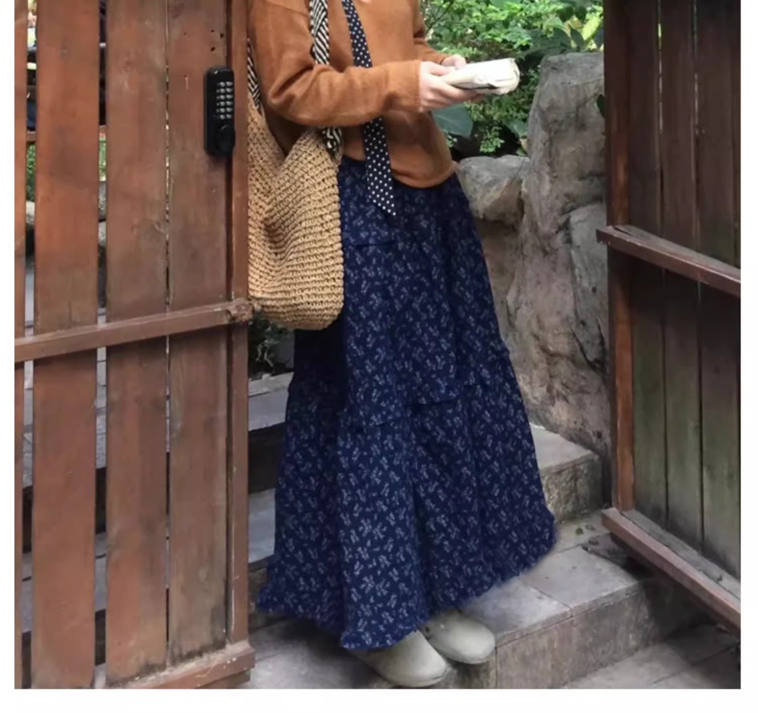 レディーススカート 春秋冬新作 韓国風 レトロ ブルー 花柄 ゆったり ロングスカート ハイウエスト Aラインスカート