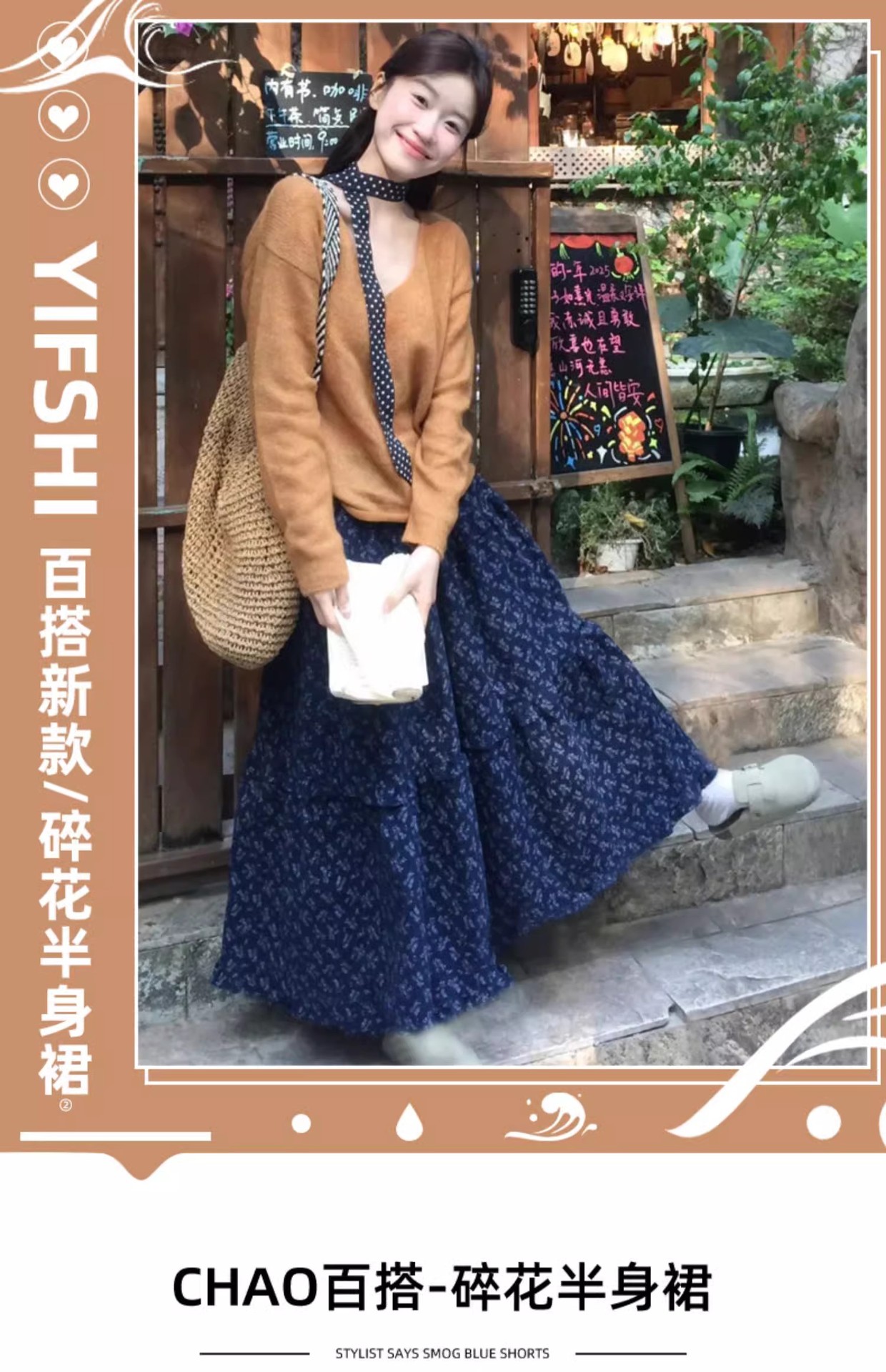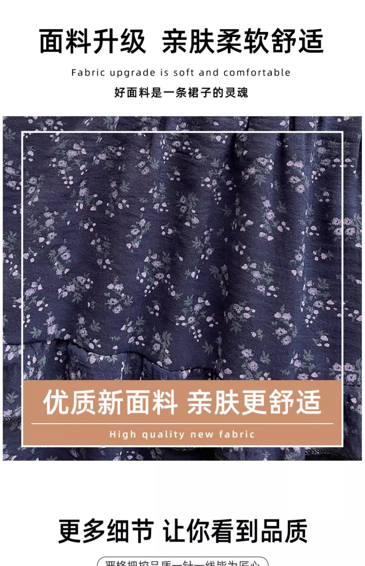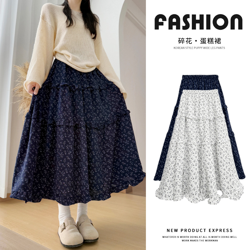藏青色碎花半身裙女长款秋季2025新款高腰显瘦a字长裙蓬蓬蛋糕裙