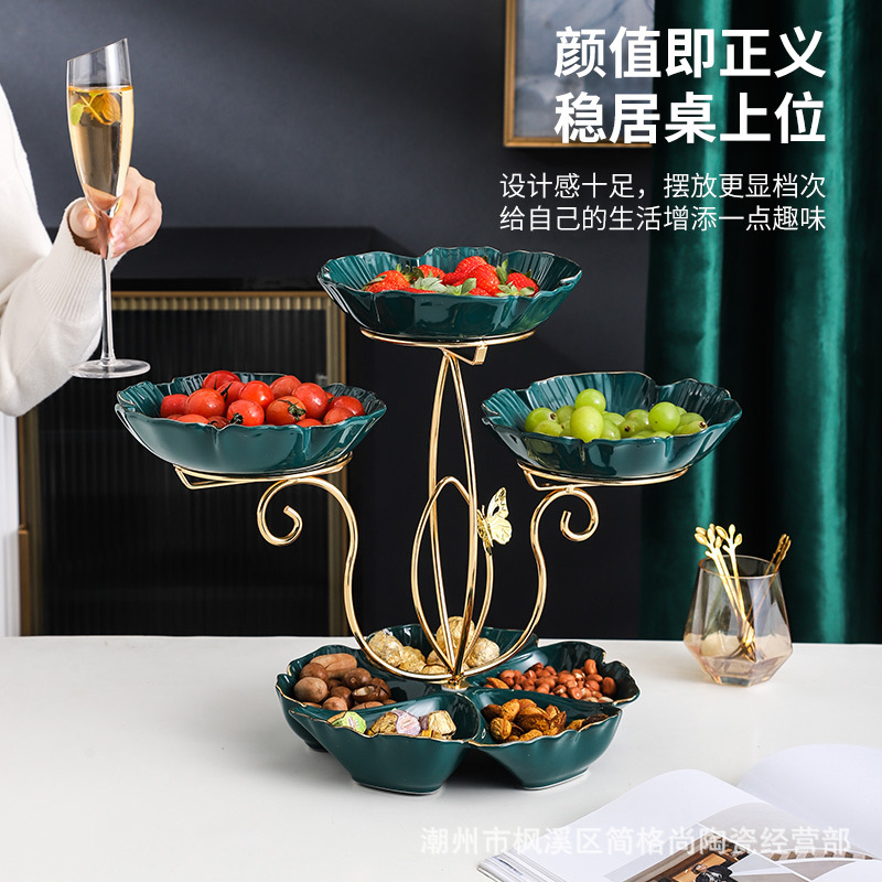 北欧の軽い豪華な高顔の価値の多層の大きいサイズの陶磁器の果物の皿の家庭用の客間のお茶のいくつかのキャンディーの皿の乾燥している果物の小食の皿