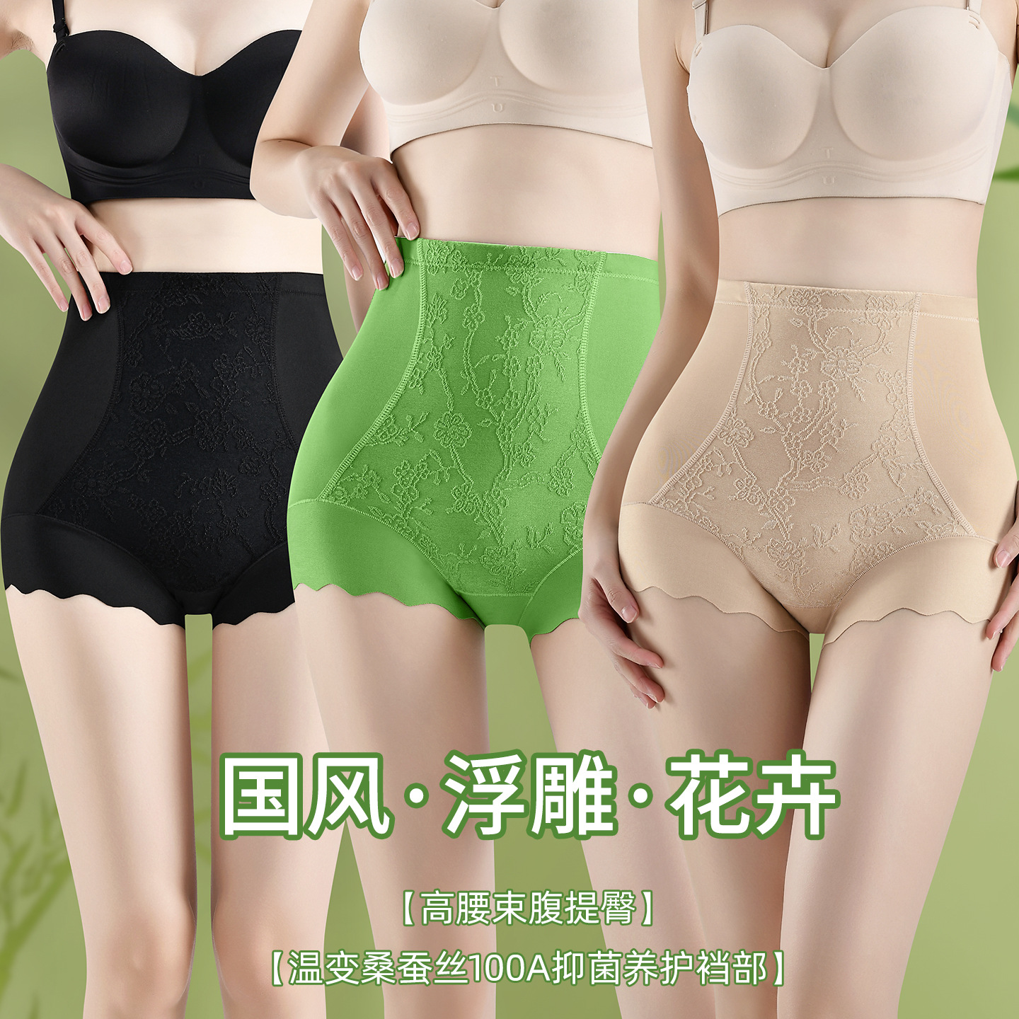 浮雕花卉高腰收腹提臀裤强力收小肚子无痕蕾丝桑蚕丝裆三角塑身裤