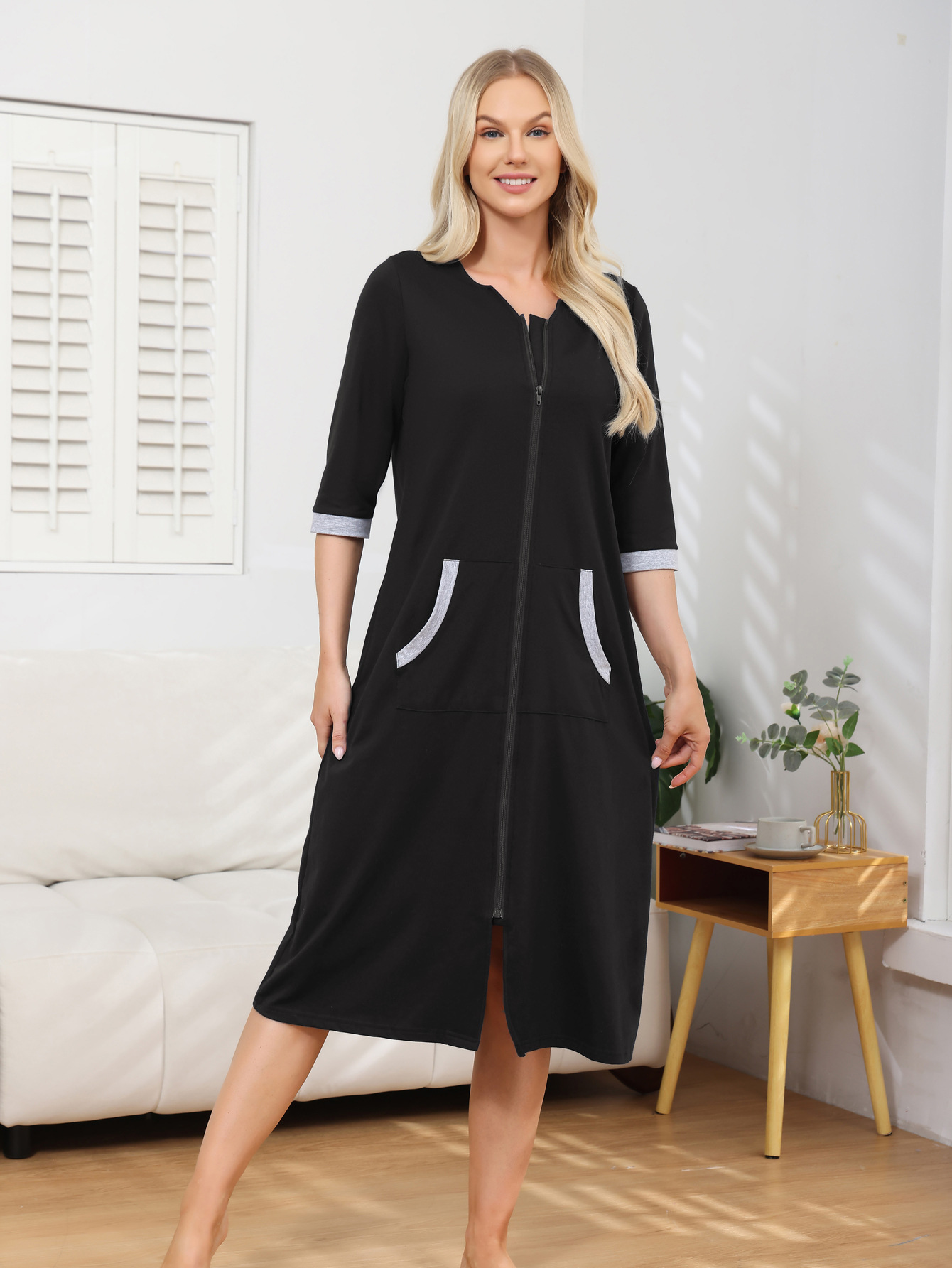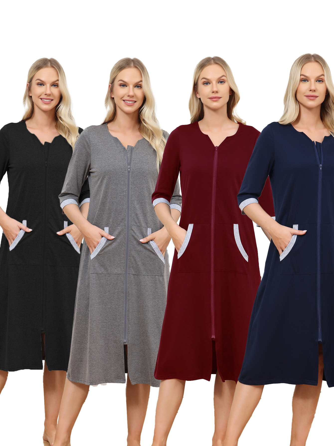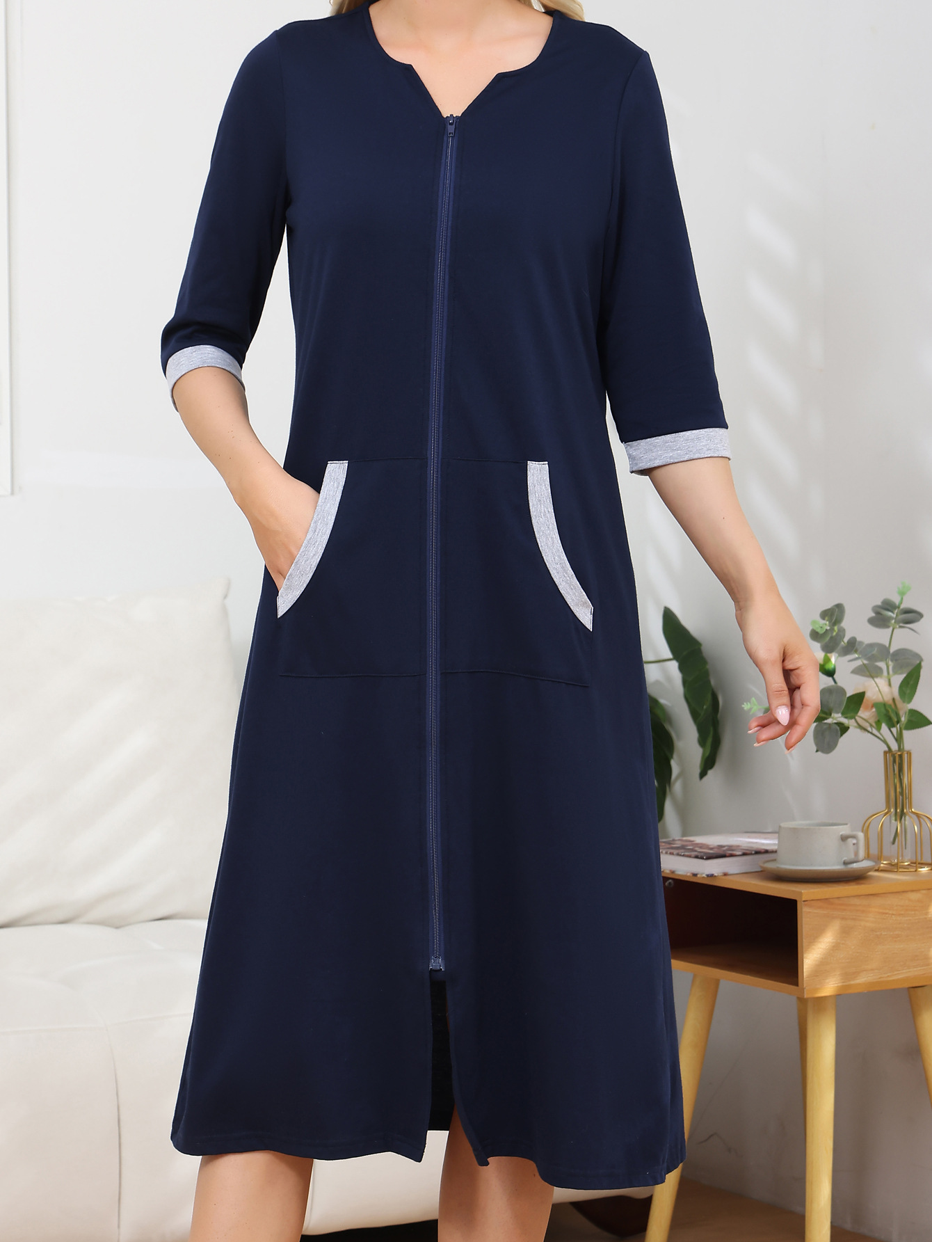 欧美跨境女士睡裙家居服亚马逊时尚舒适圆领拉链款长袖直筒连衣裙