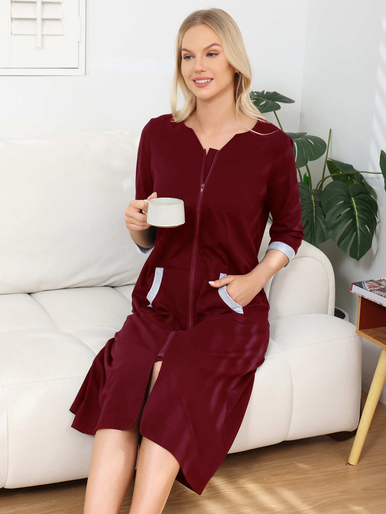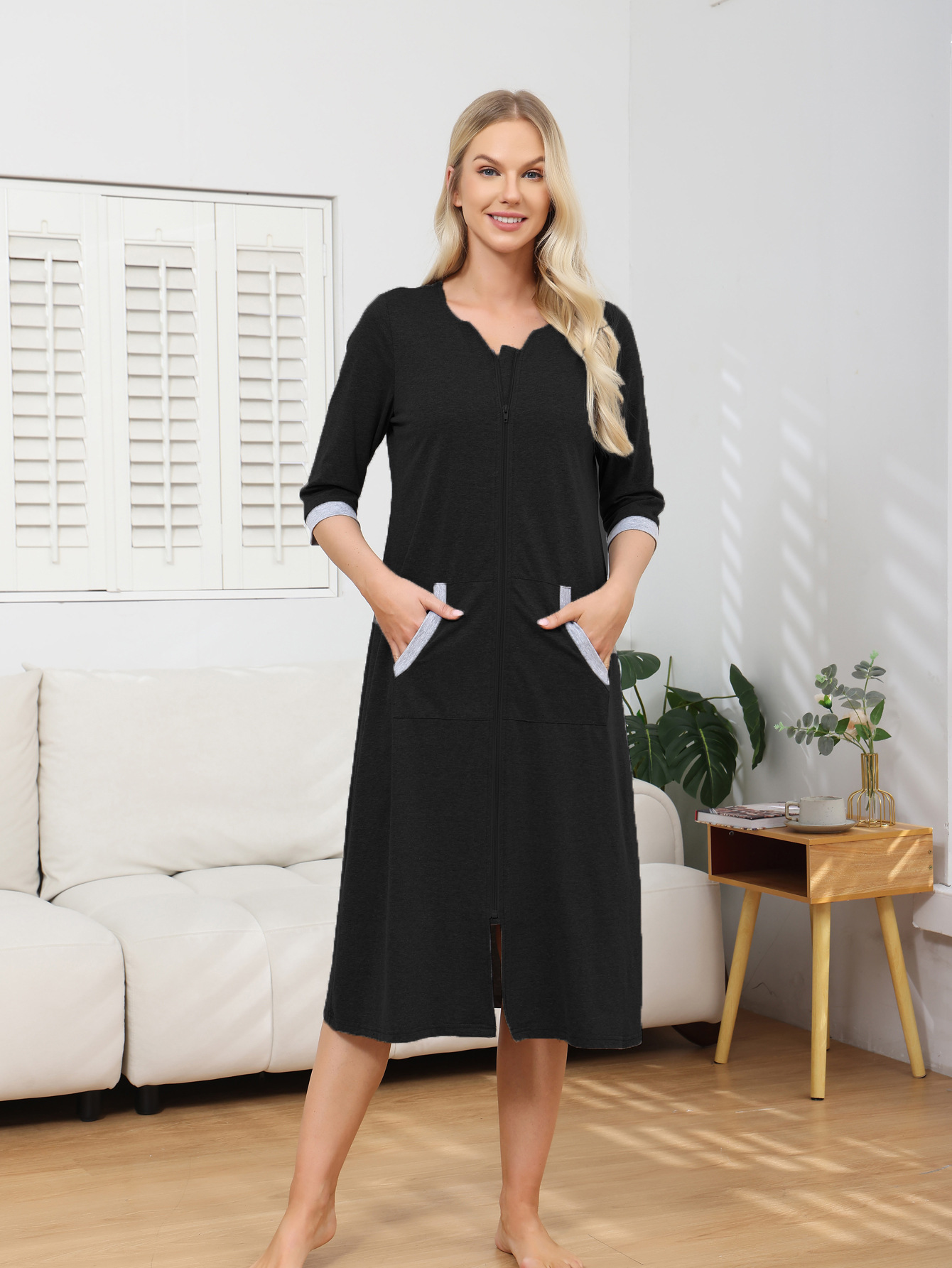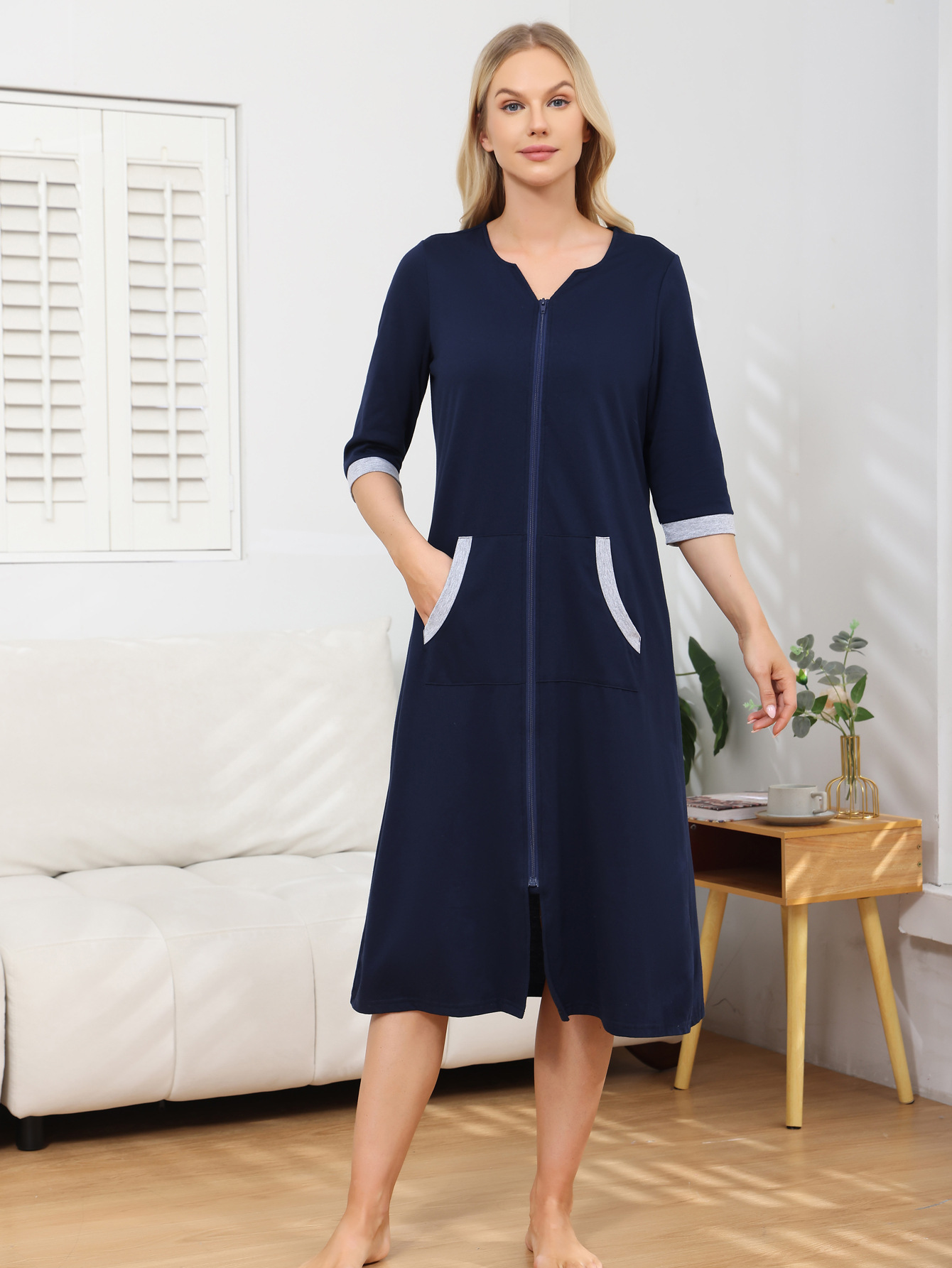 欧美跨境女士睡裙家居服亚马逊时尚舒适圆领拉链款长袖直筒连衣裙