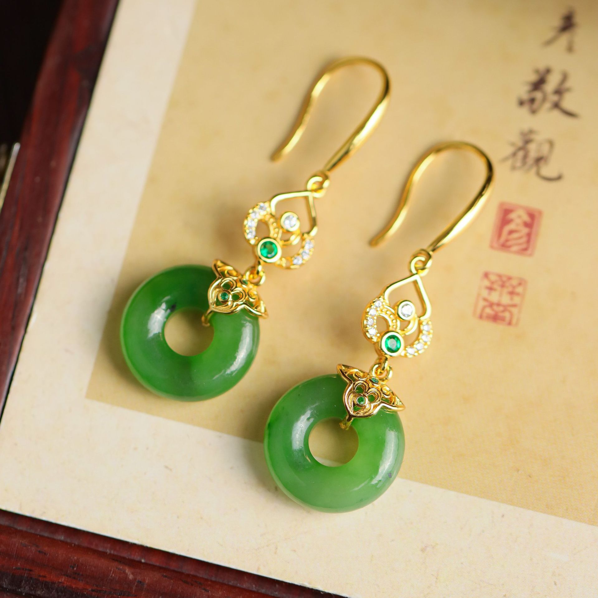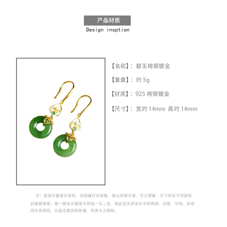 商品名 S925 シルバーゴールドメッキ天然和天翡翠碧玉如意安全バックルイヤリング中空デザイン翡翠ジュエリー卸売