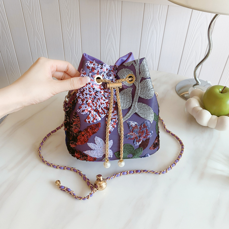 女性のカバンの新しい中国式の花の刺繍のスパンコールの網の糸は色の湿っている優雅な女性のチェーンのバケツの包みをつなぎ合わせます。