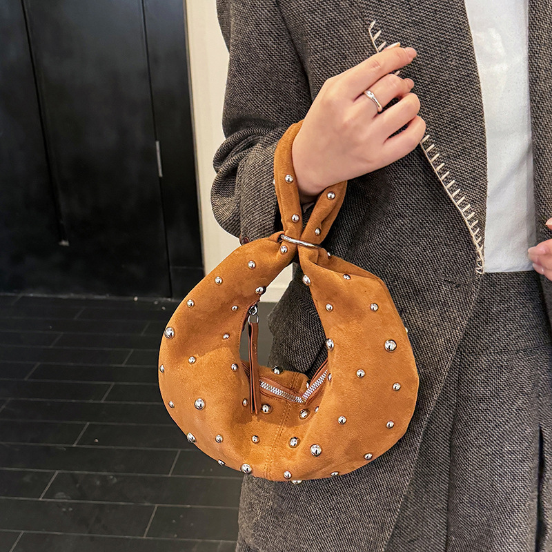 手提包女士包包高级质感麂皮绒圆形立体铆钉镶嵌圆形包个性单肩包