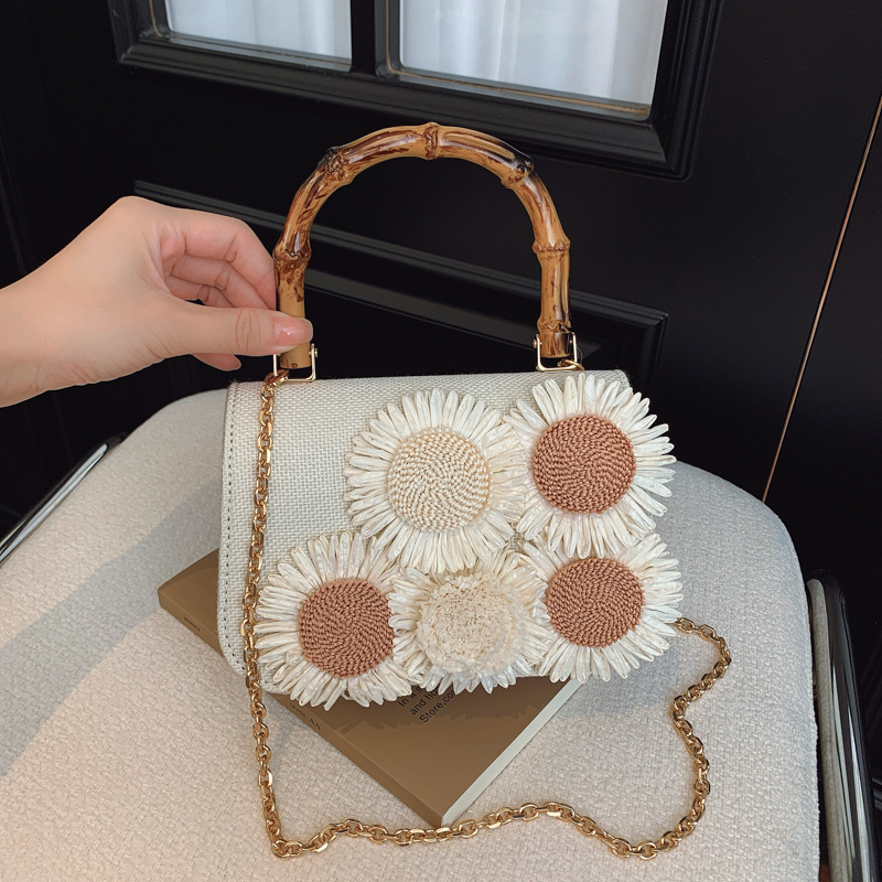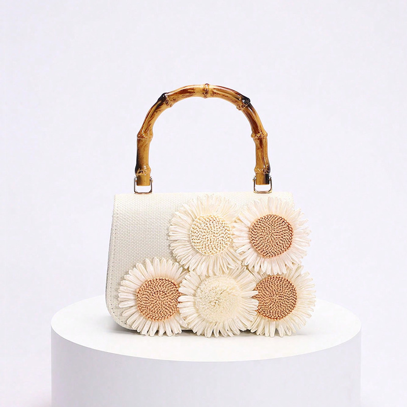 国境を越えた人気の2025年トレンドリネンベース生地アップリケ立体デイジー竹ハンドバッグファッショナブルでエレガントなホリデースタイル