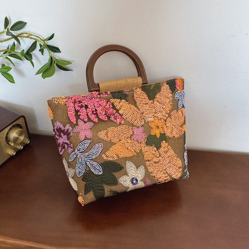 国境を越えた亜麻竹節ハンドバッグ2025新型中国風ファッション文芸女性花大容量ハンドバッグ