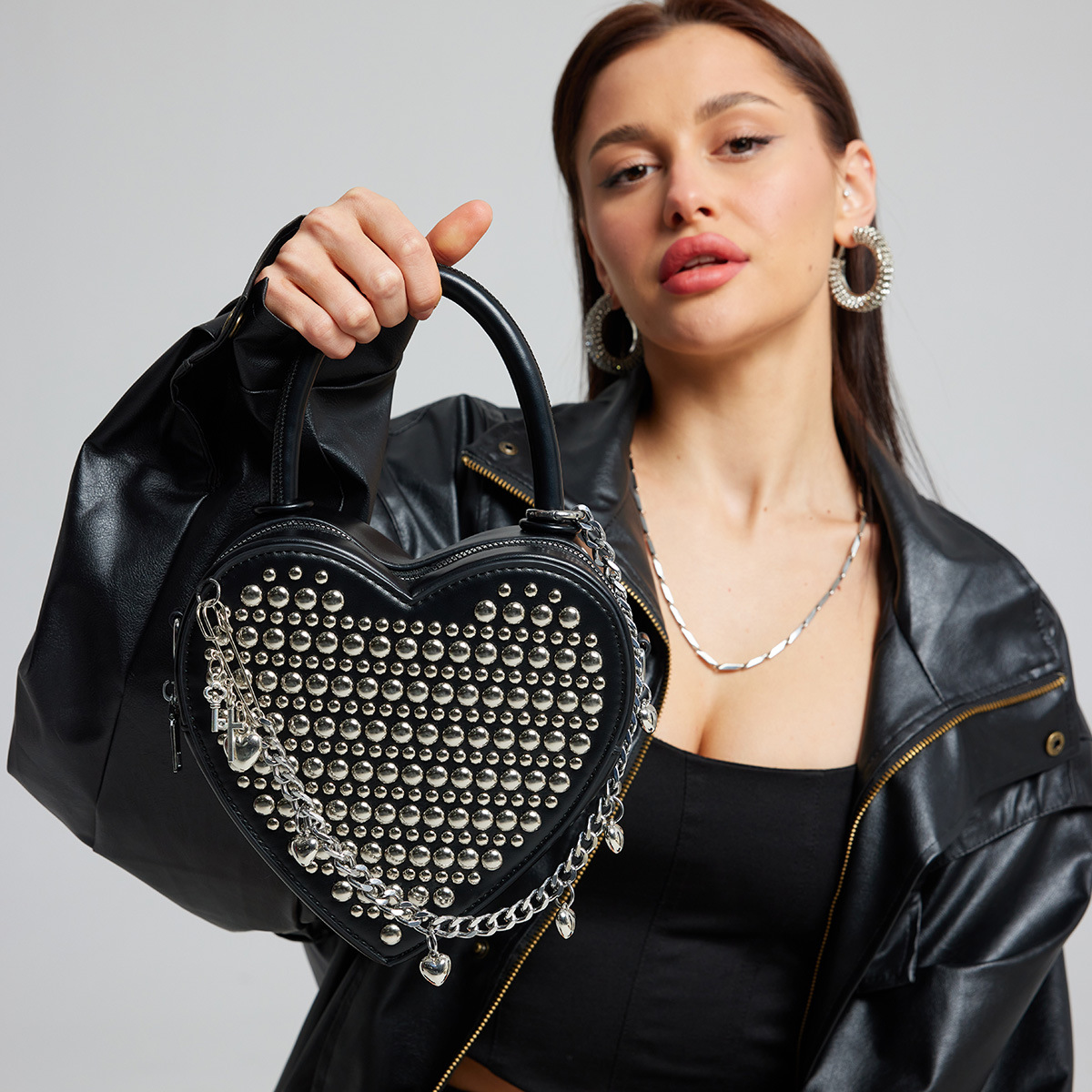 高級感愛バッグ女性2025新型両面リベットに潮チェーンをはめ込んだ流蘇ハート型手提げ斜め掛けバッグ