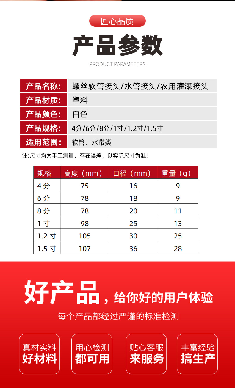 此商品每个规格后面都有每串的包装数量,请按照包装的数量下单,千万不要随便拍数量哦!商品价格都是以个为单位,不是一串哦!商品有带螺纹帽也有带卡口的,下单的时候可以备注一下或者找客服备注。不备注的亲我们默认发哦!4分6分8分1寸1.2寸1.5寸2寸4寸都是螺纹帽,2.5寸是卡扣设计。外径是量插管的最粗位置,人工测量有误差,介意者慎拍。