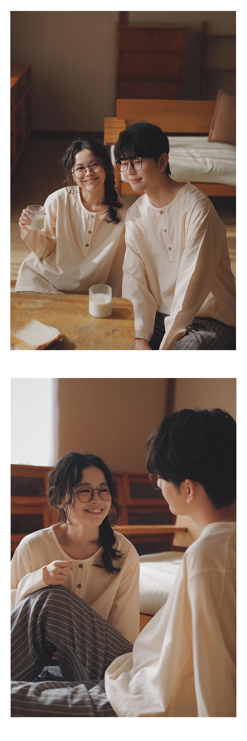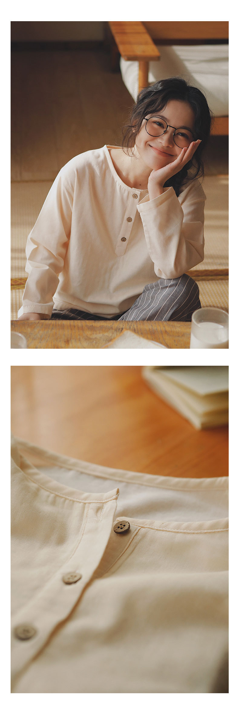 返璞77-無印パジャマ メンズ&レディース カップル向けホームウェア 純綿ガーゼ長袖セット 女性用 春秋 外でも着用可能