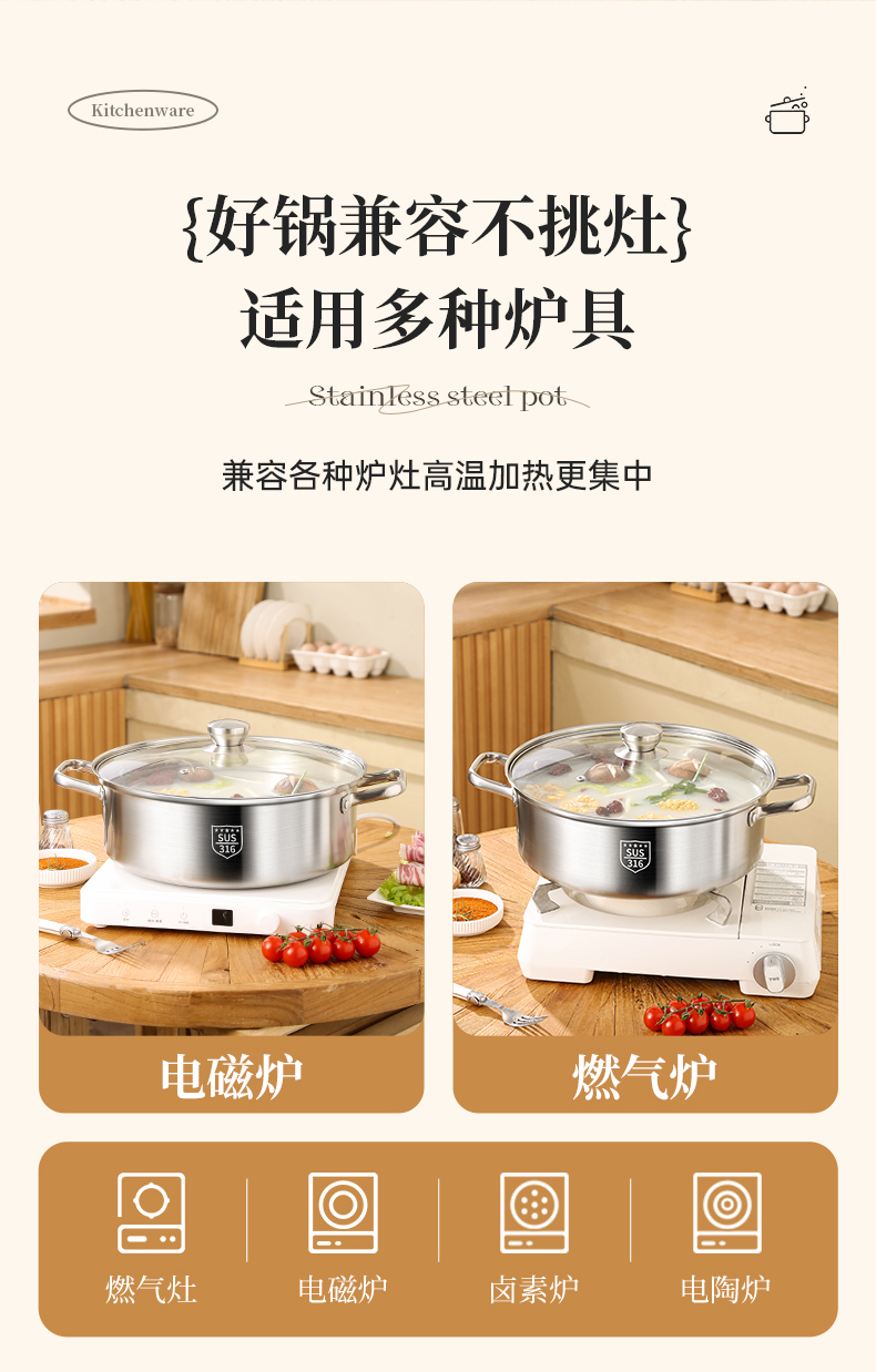 316不锈钢食品级加厚鸳鸯锅家用电磁炉涮锅耐高温火锅大容量汤锅