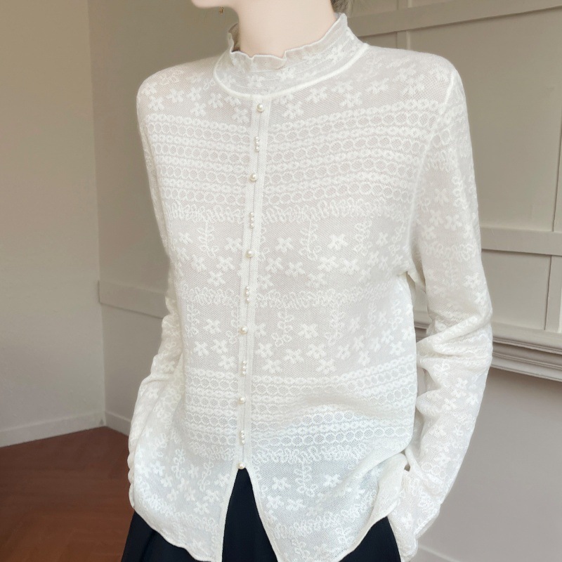 精纺羊毛欧根纱内搭打底女式半高领针织衫秋冬新款蕾丝提花工艺款