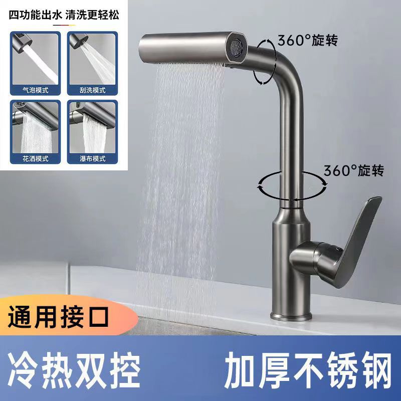 キッチンフライングレイン1080度滝状4段階吐水洗い流しシンク回転式温冷水栓304ステンレス鋼