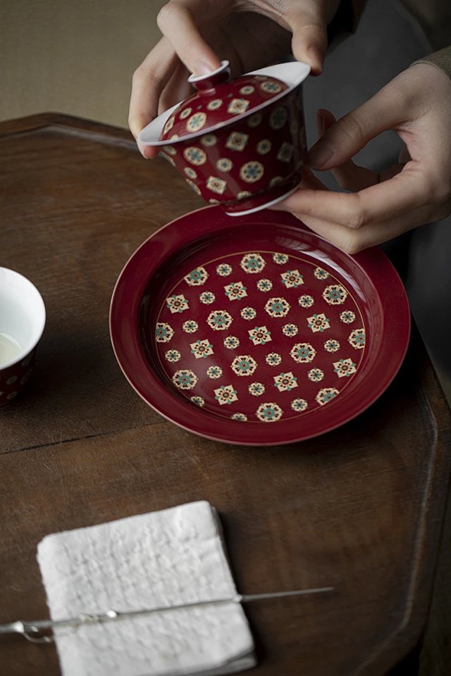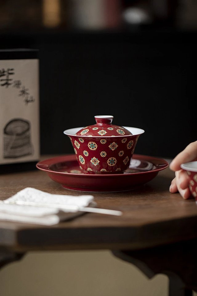 新中国式郎紅琵琶紋蓋碗純手作り陶磁器泡茶碗茶杯レトロ国潮工夫茶具蓋碗