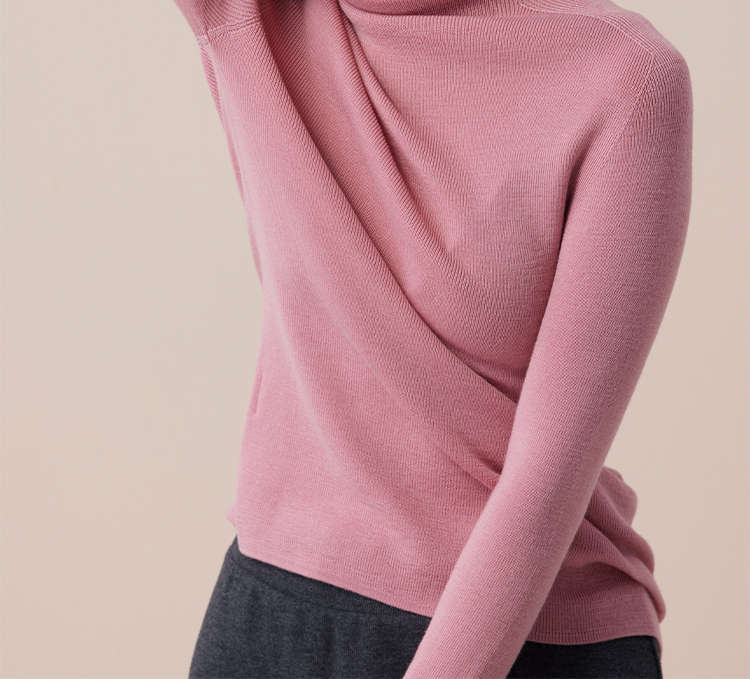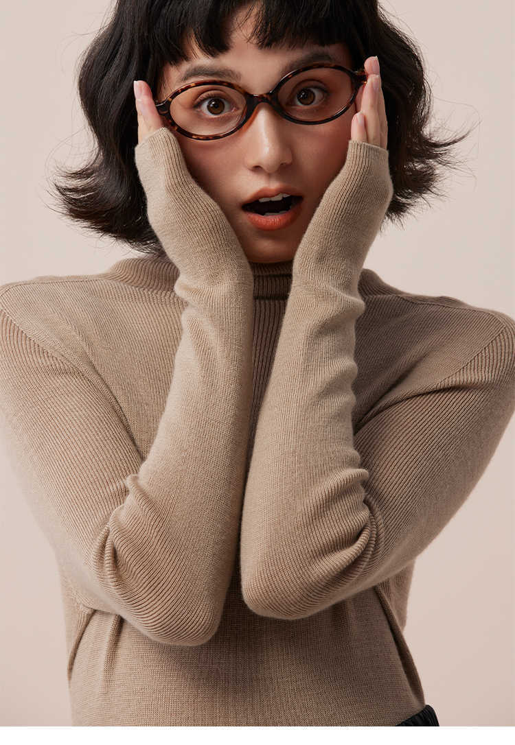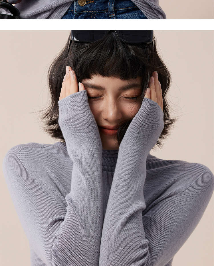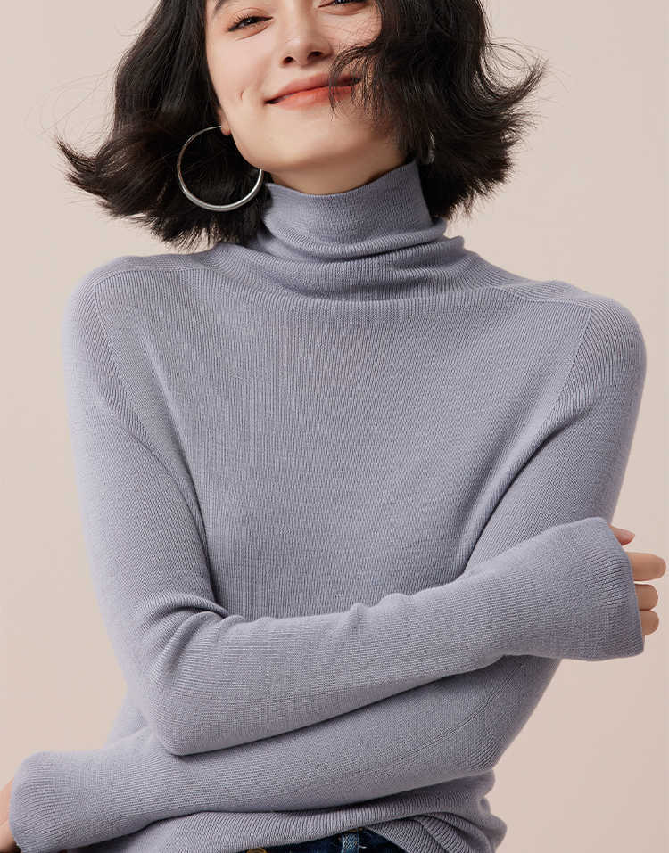 シームレス一体100% ウールベリー紫系高襟シャツの中に上着を着てセーターを着ている女性