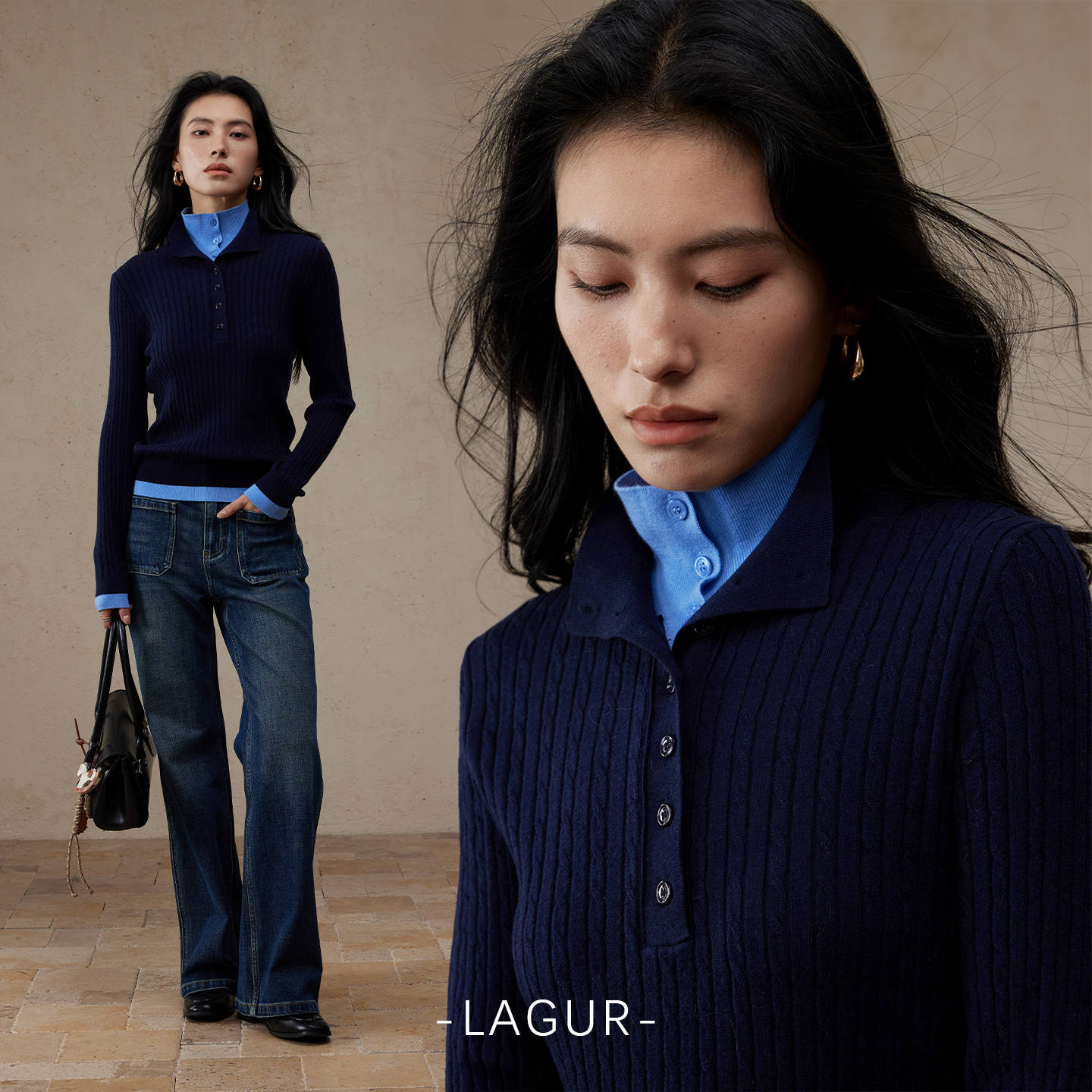 Lagur【双领层次感套头针织衫】羊毛混纺复古麻花立领毛衣女秋冬