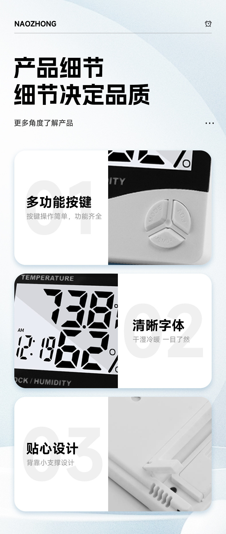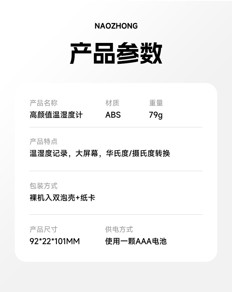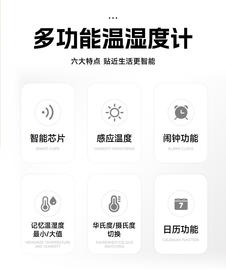它会告诉我们室内是需要加湿还是需要抽湿,作为了您健康居室的提醒器!如果湿度显示LL或--就说明室内湿度太低,需要加湿,并非质量问题哦!