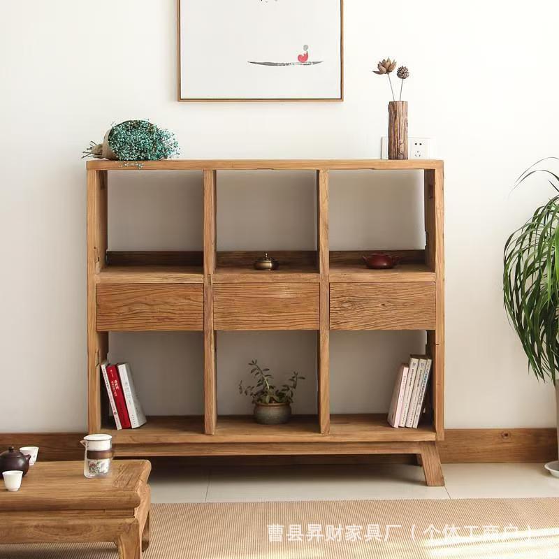 新中式古木棚 老榆木 リビングディスプレイ棚 無垢材収納棚 書棚 多宝閣 茶棚 預金