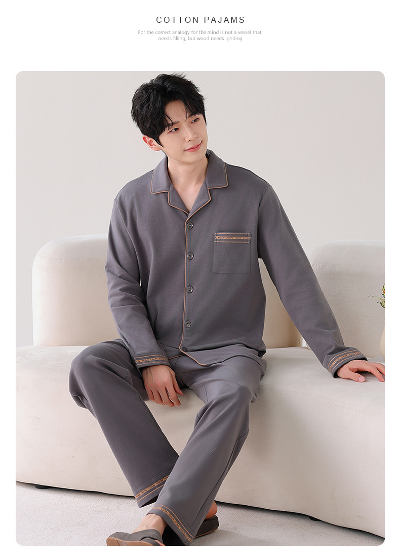 男性の純綿パジャマ春と秋の新作の純色は大きいサイズをプラスして長袖のカーディガンの綿の部屋の服のスーツを着ることができます。