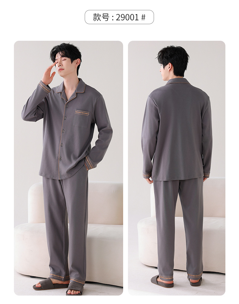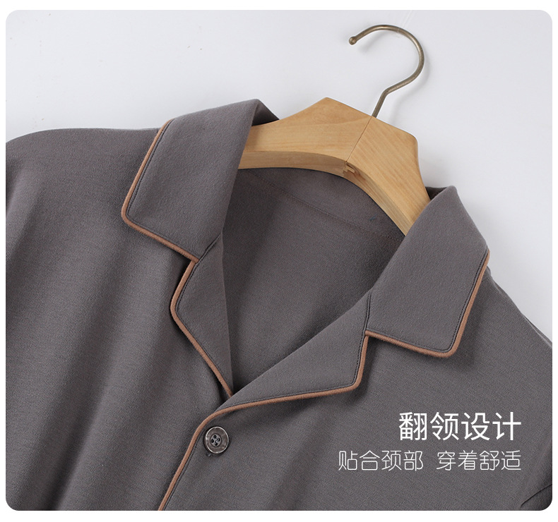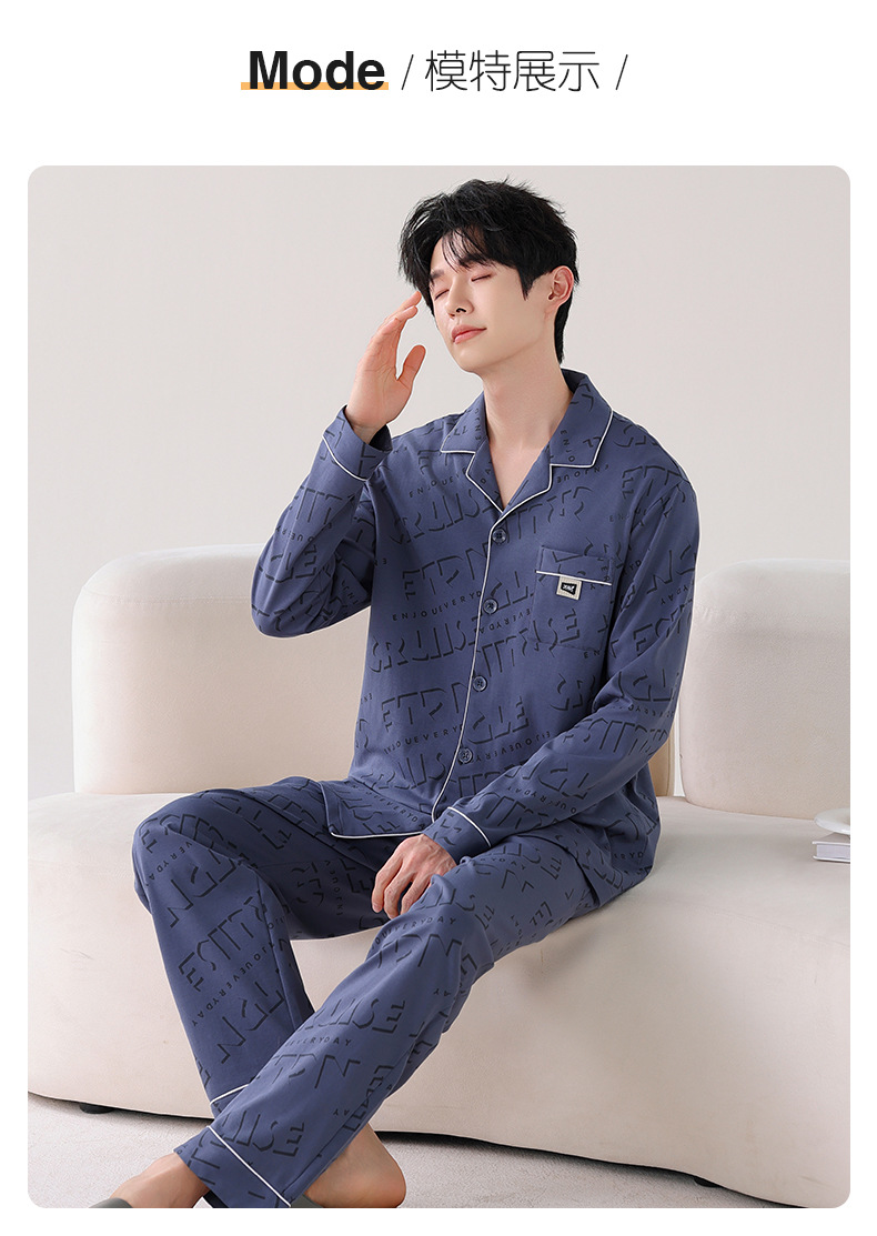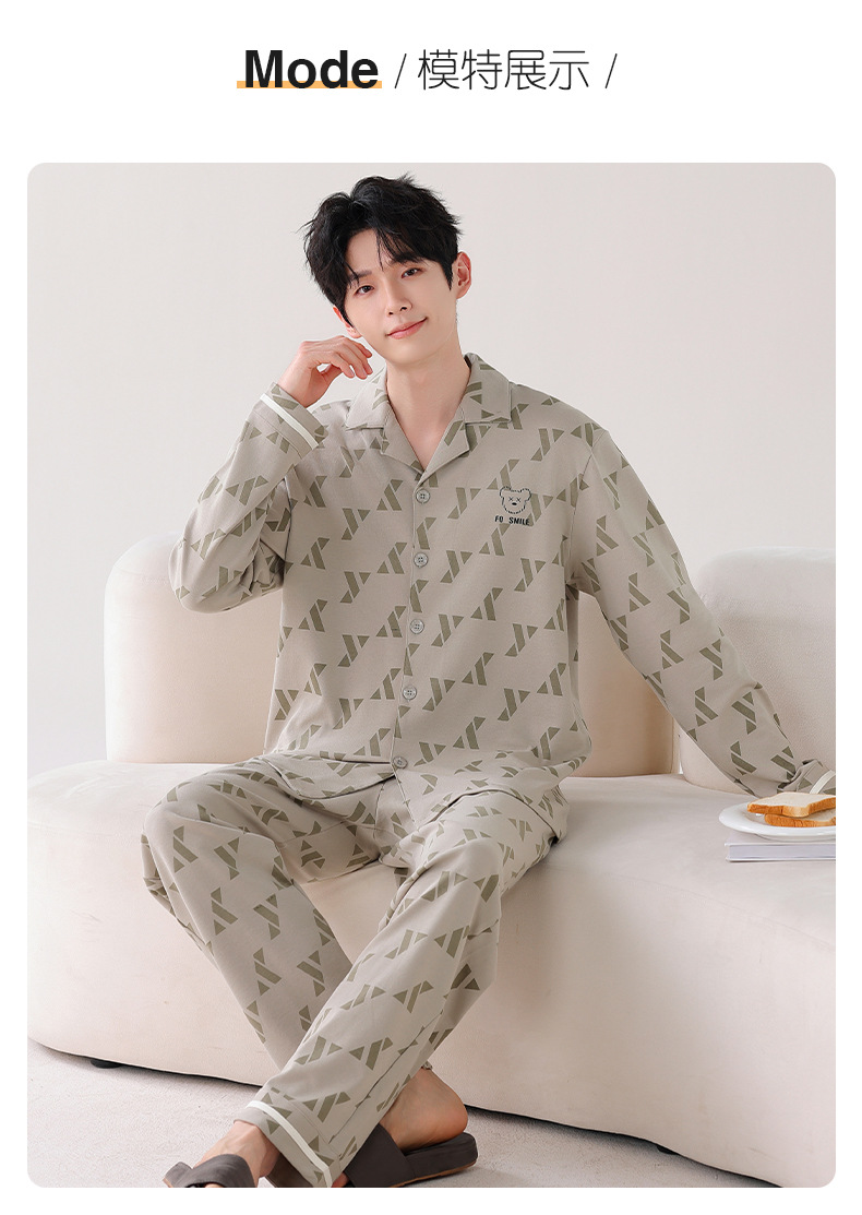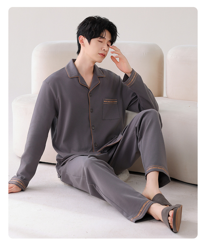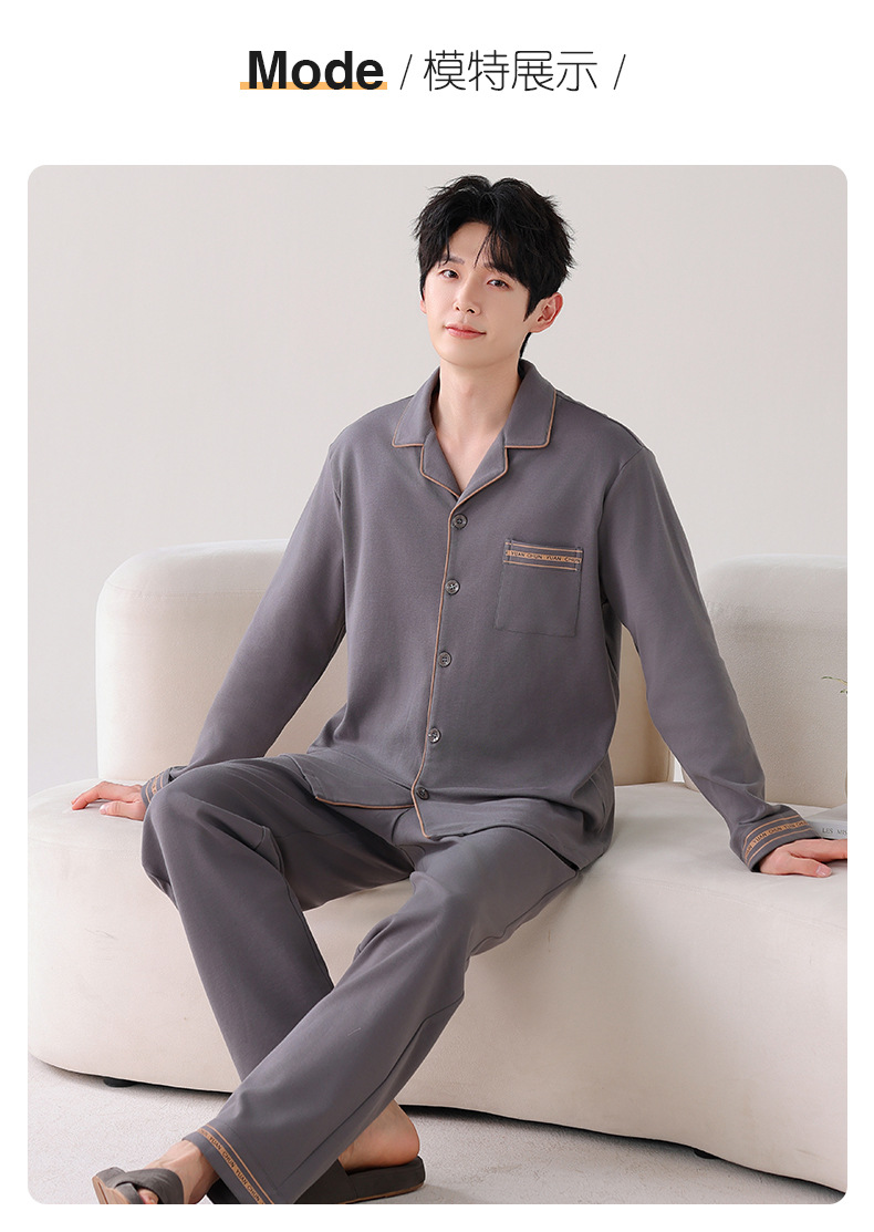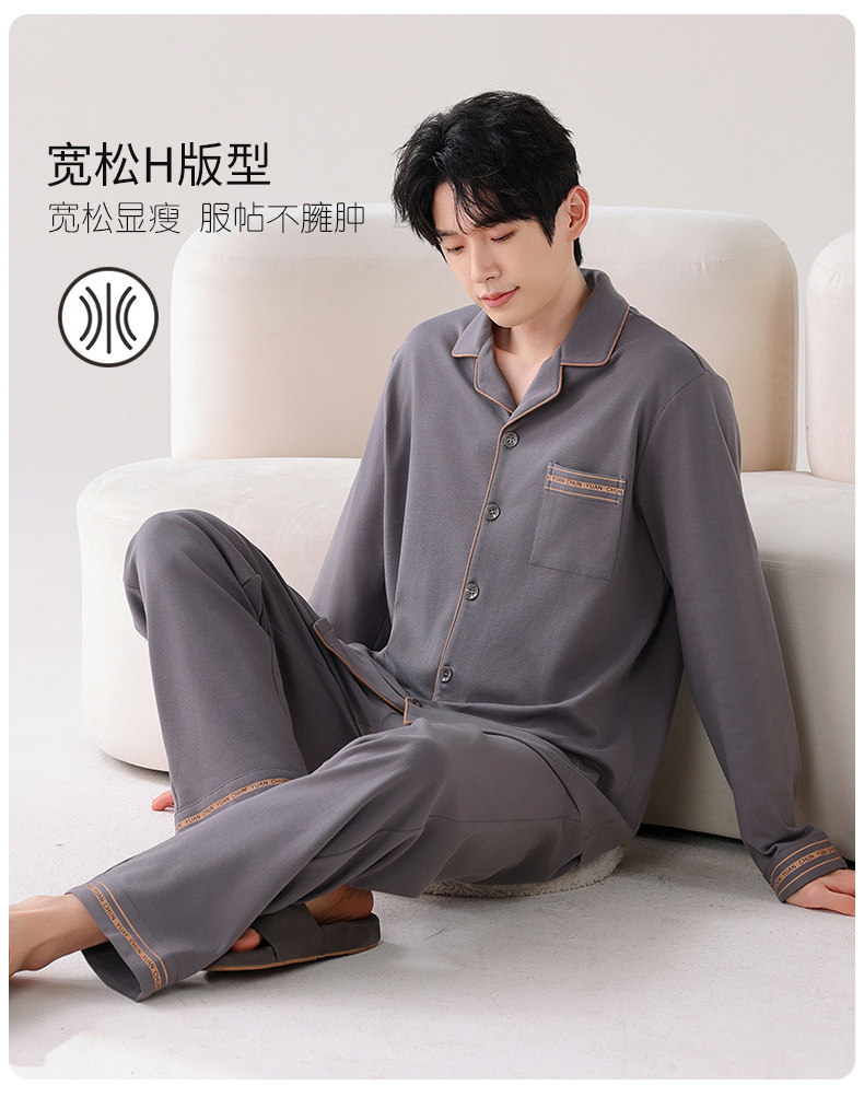 双面纯棉新款男睡衣长袖翻领开衫大码秋冬季可外穿全棉家居服套装