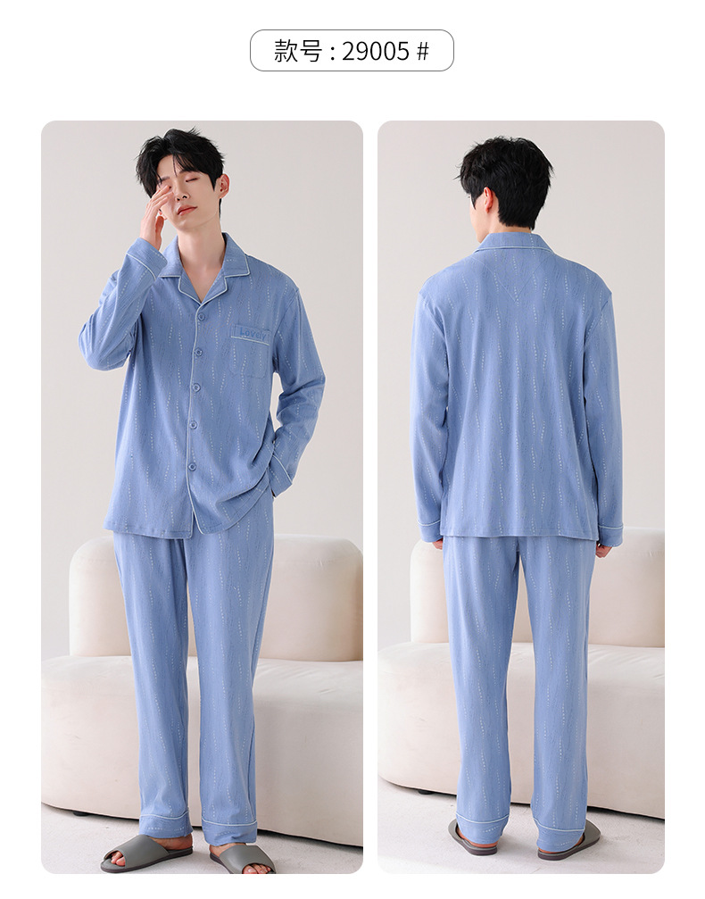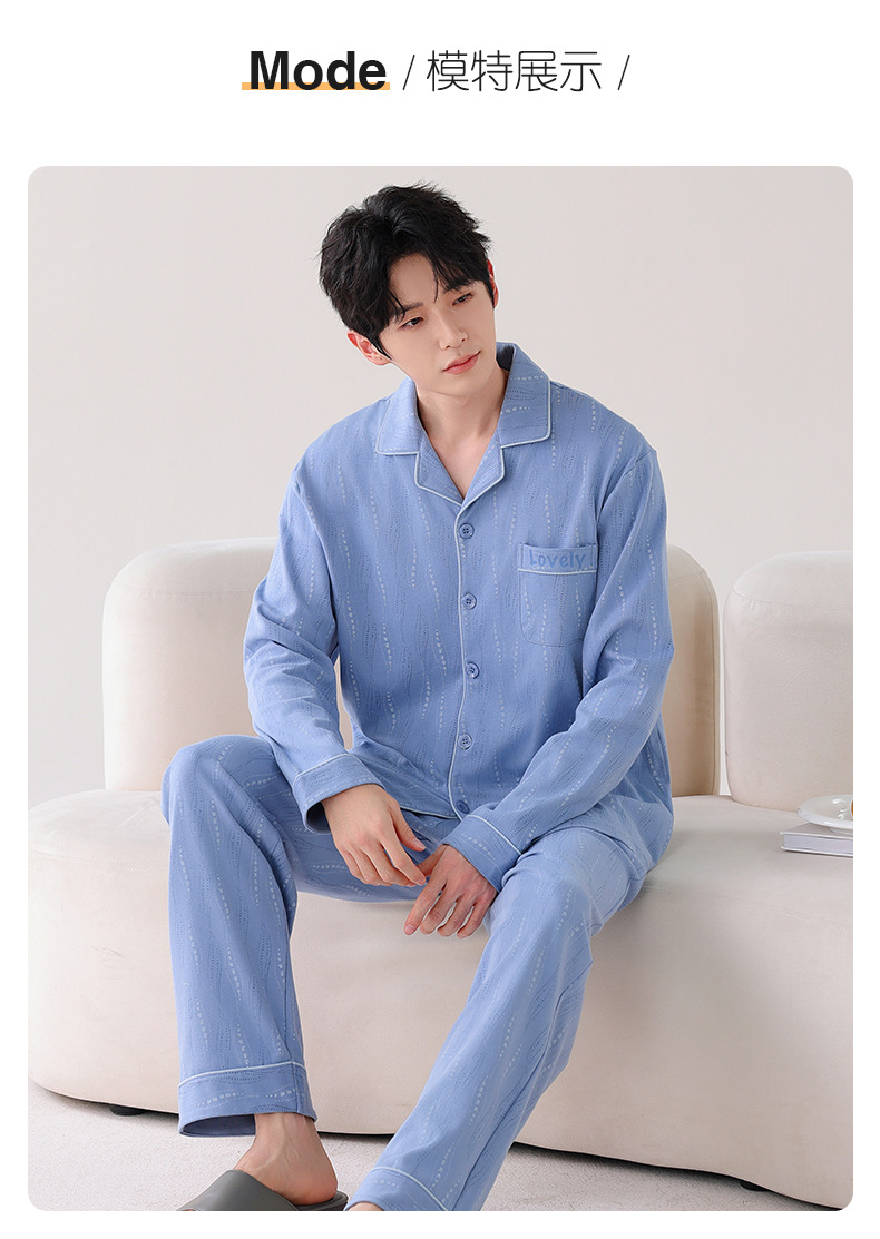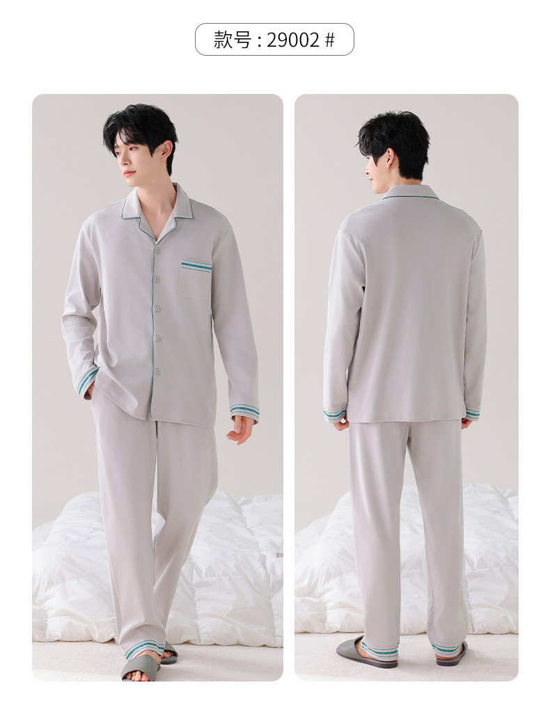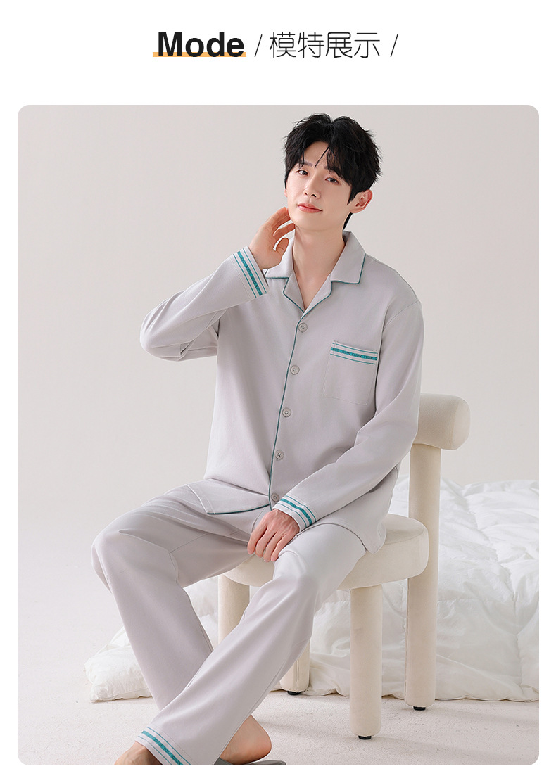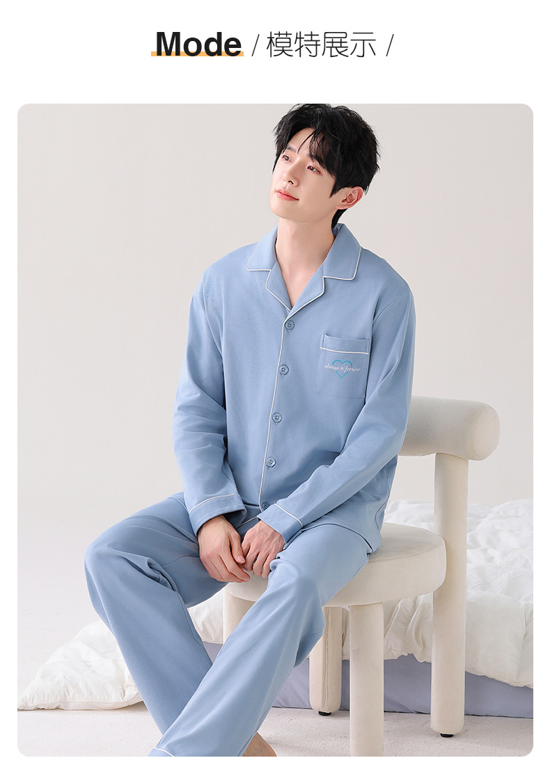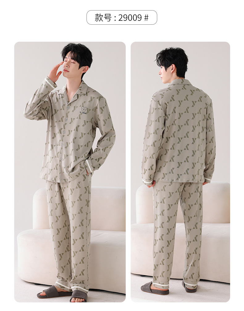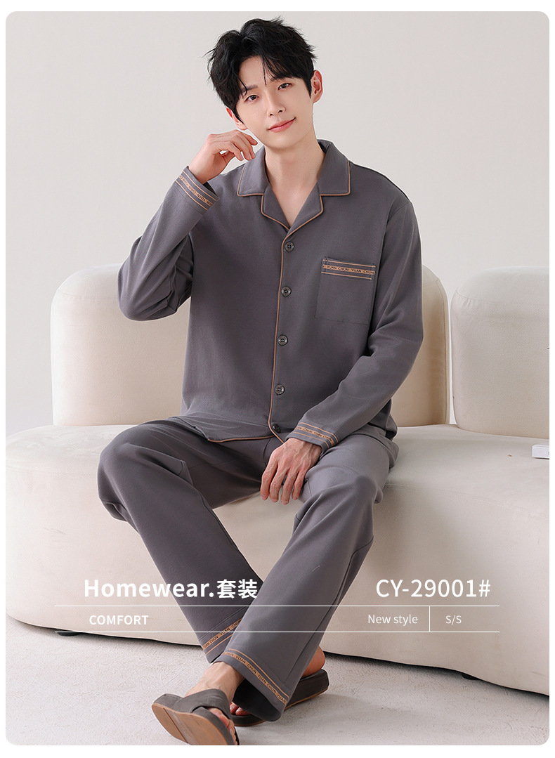 双面纯棉新款男睡衣长袖翻领开衫大码秋冬季可外穿全棉家居服套装
