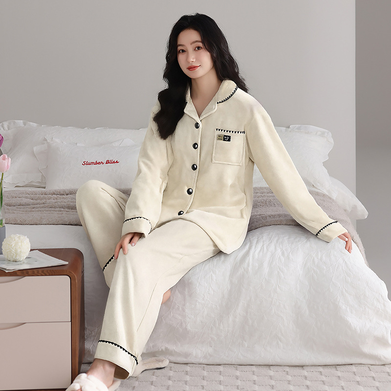 秋冬季新款睡衣女海岛绒翻领加厚加绒保暖纯色大码长袖家居服套装