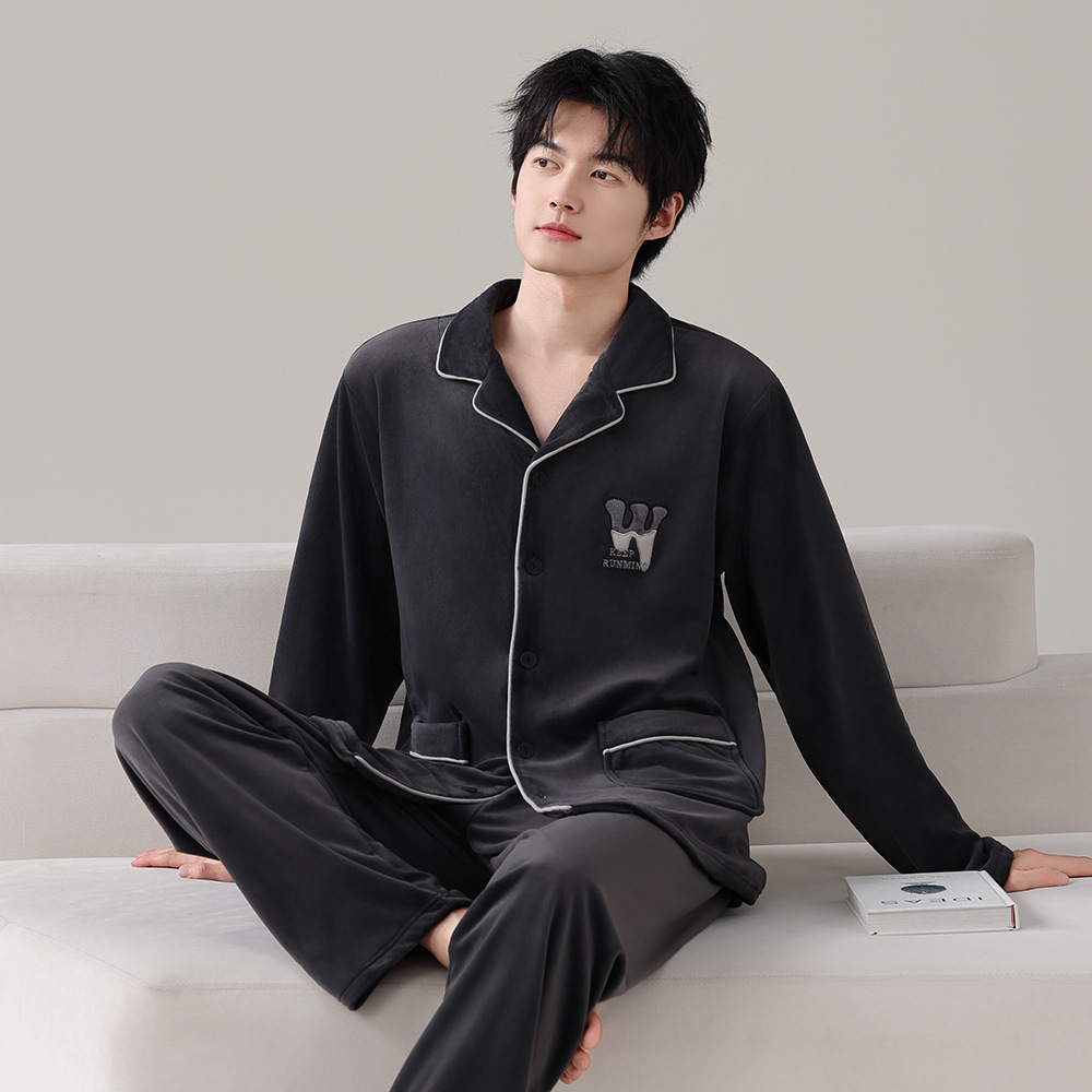 德绒睡衣男秋冬新款翻领开衫长袖休闲大码可外穿保暖两件套家居服
