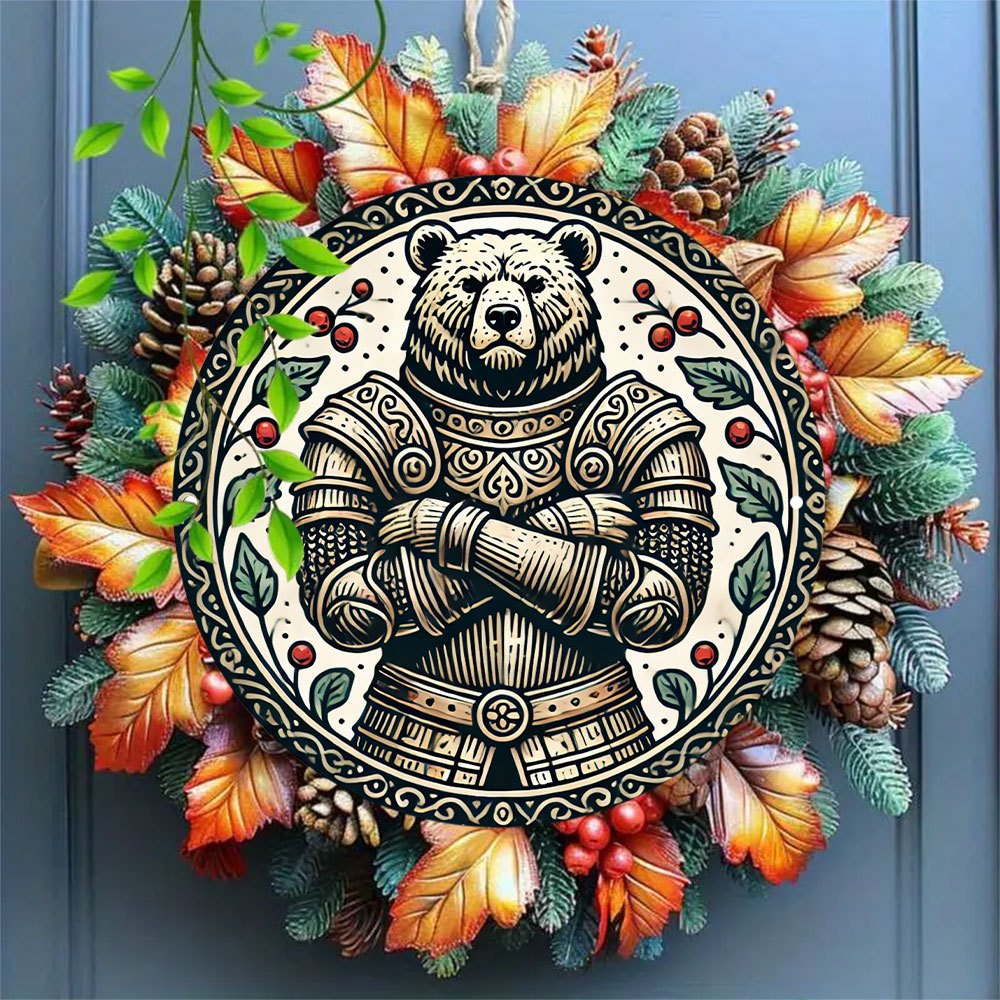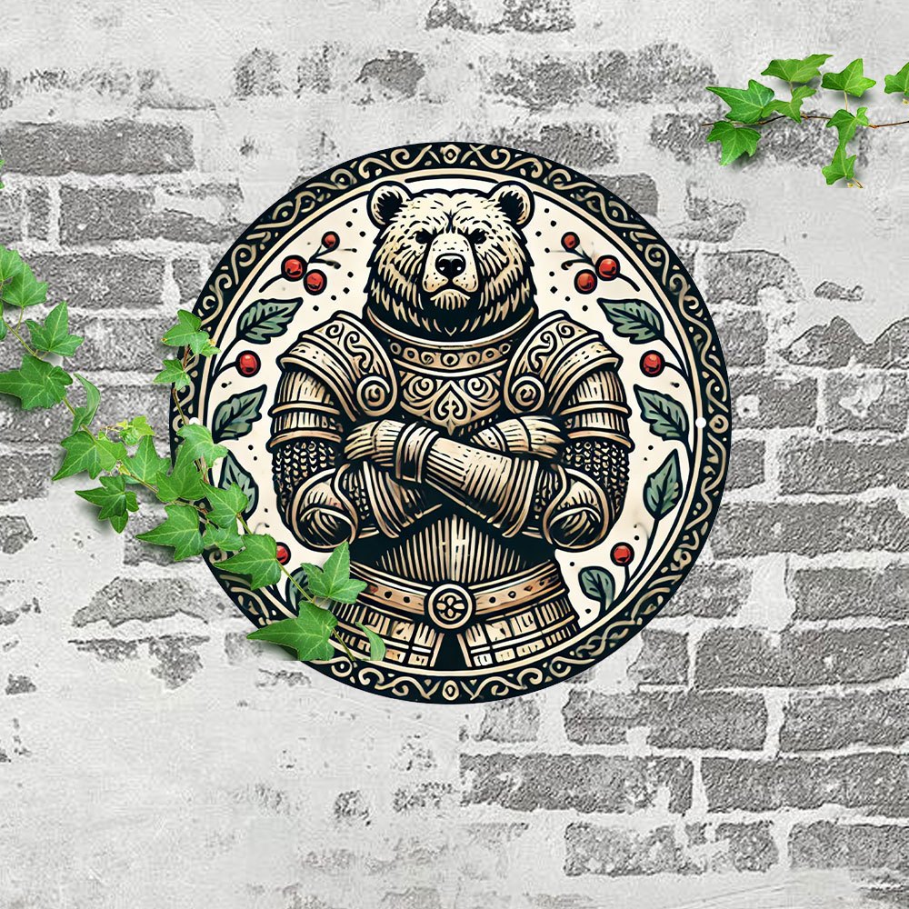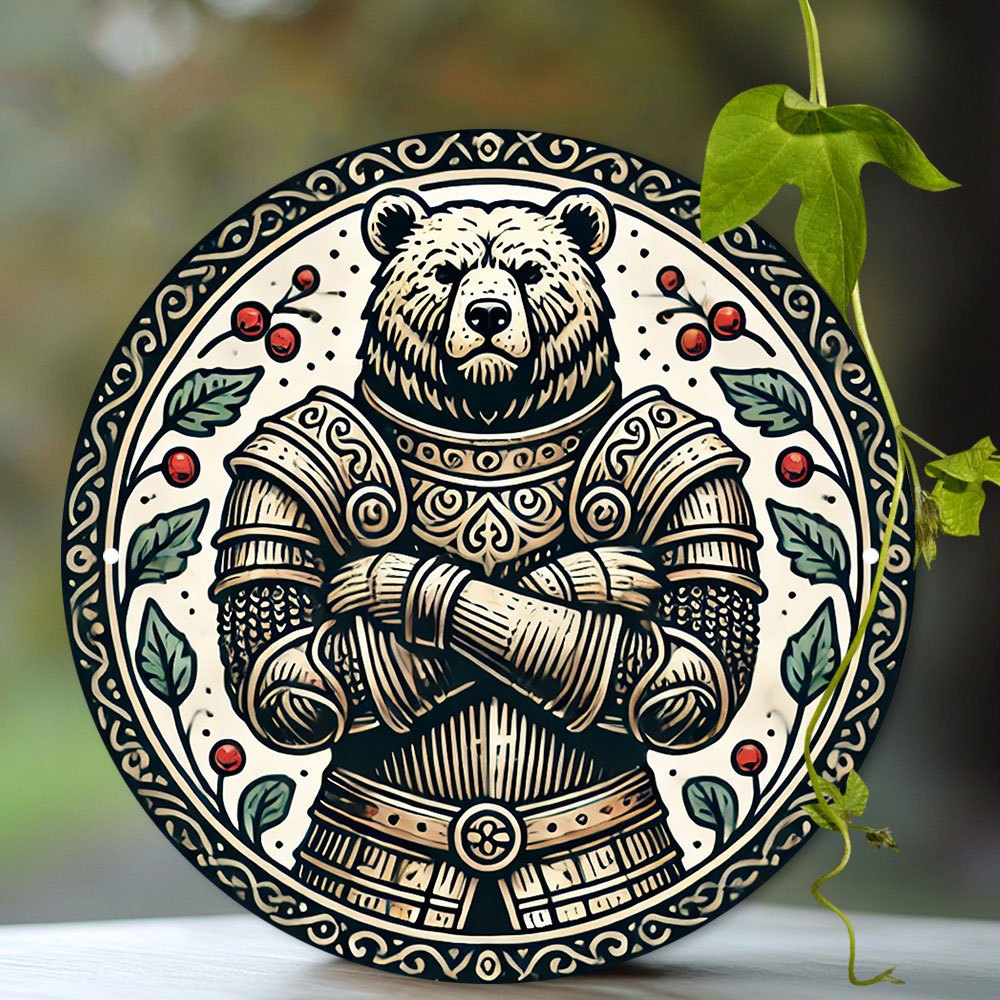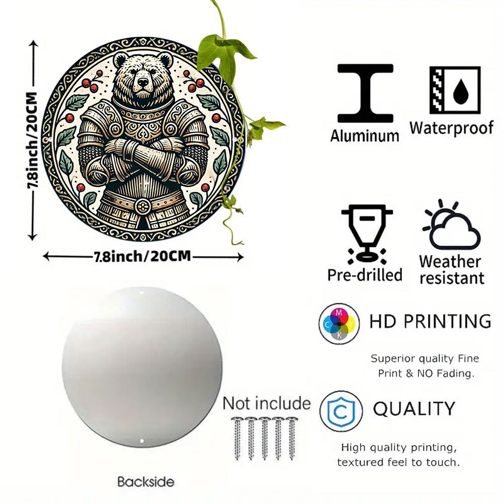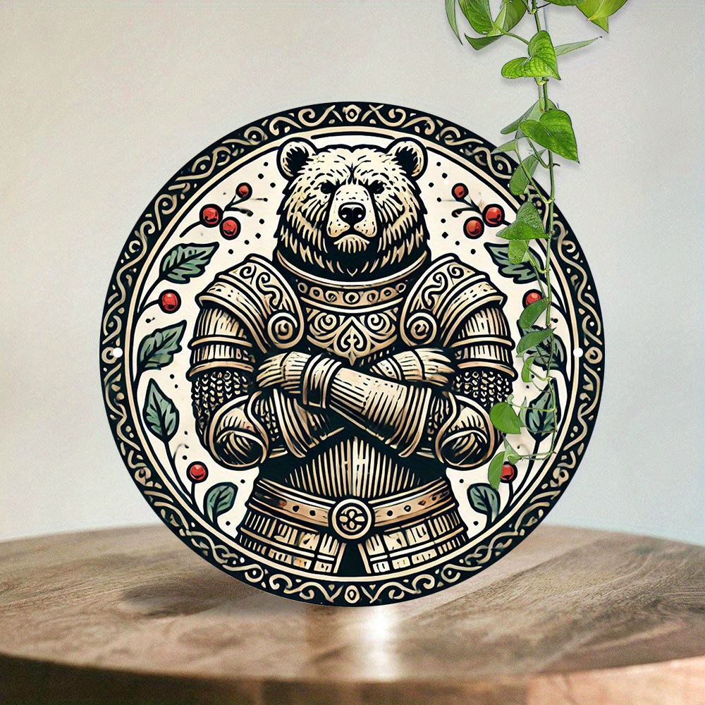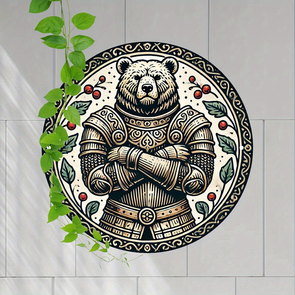 1ピース中世装甲熊ラウンドアルミ看板、7.8x7.8インチ-复雑な黒と白のデザイン