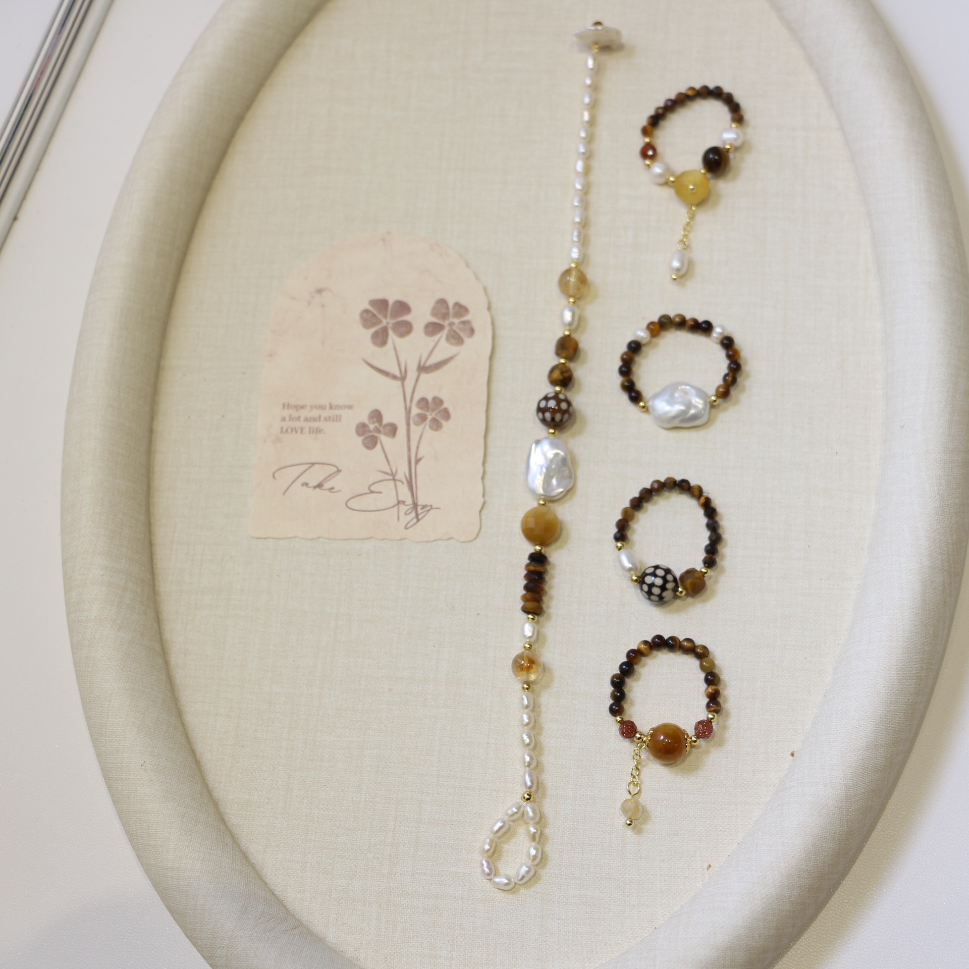 寂風退廃風瑪瑙虎眼石木珠天然石指輪オリジナル指環ビーズ指輪