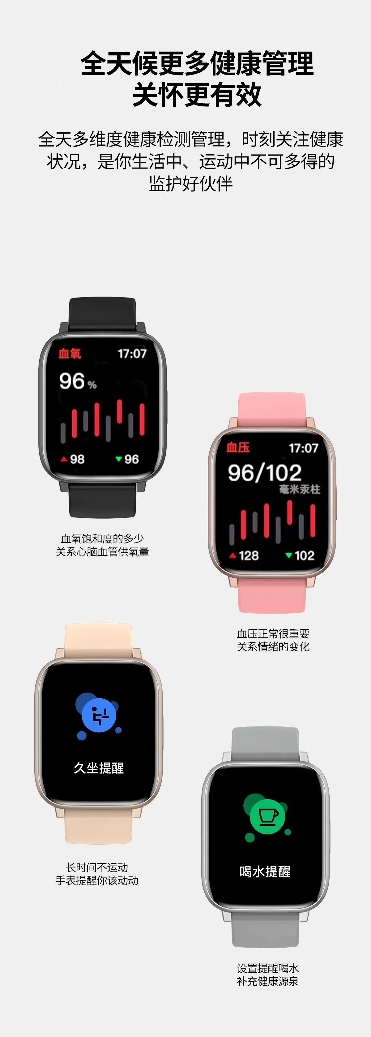 機能 歩数カウント,心拍数モニタリング,血圧測定,ソーシャルエンターテイメント,Bluetooth通話,スマートリマインダー,睡眠モニタリング,血中酸素検査